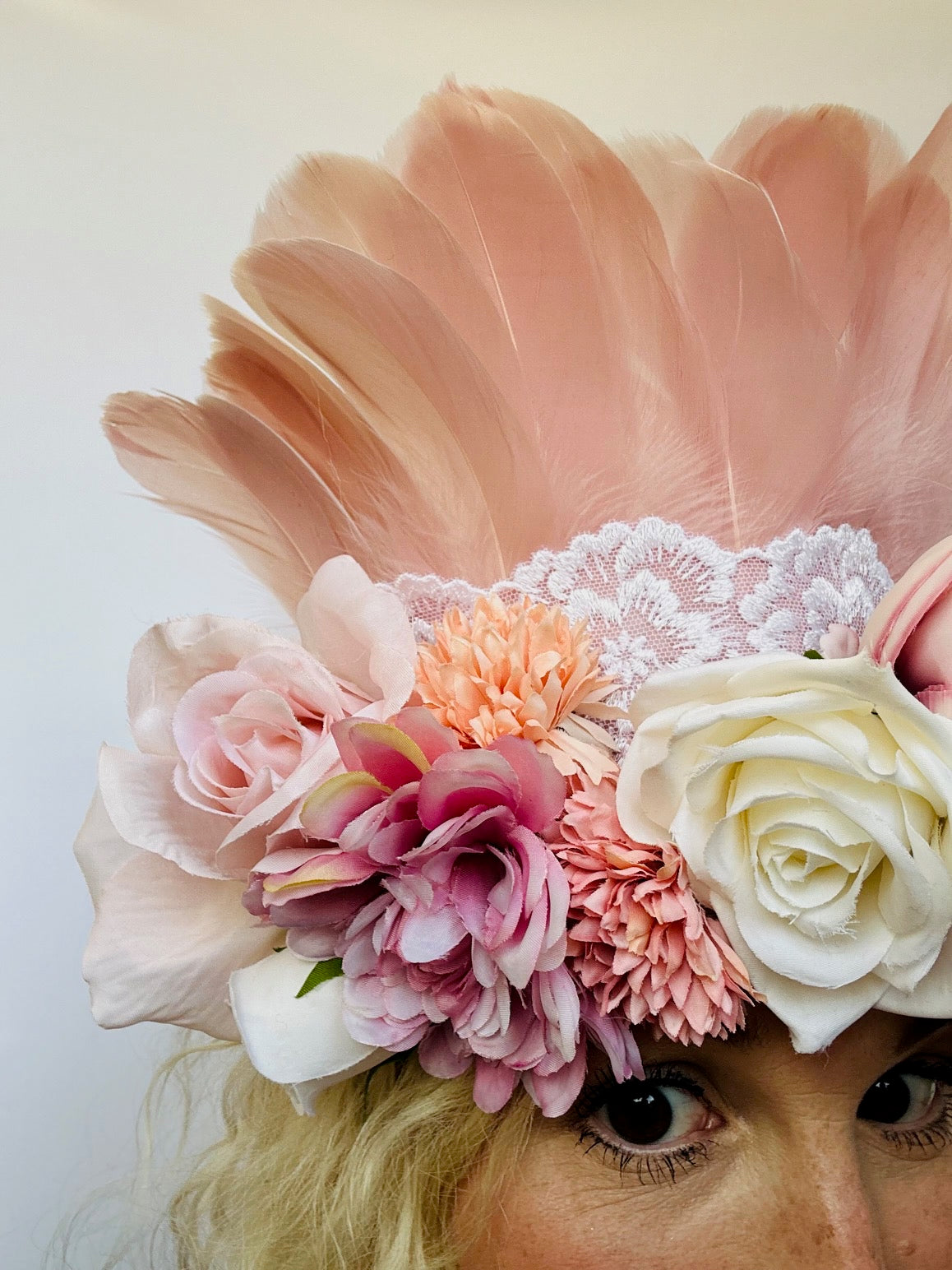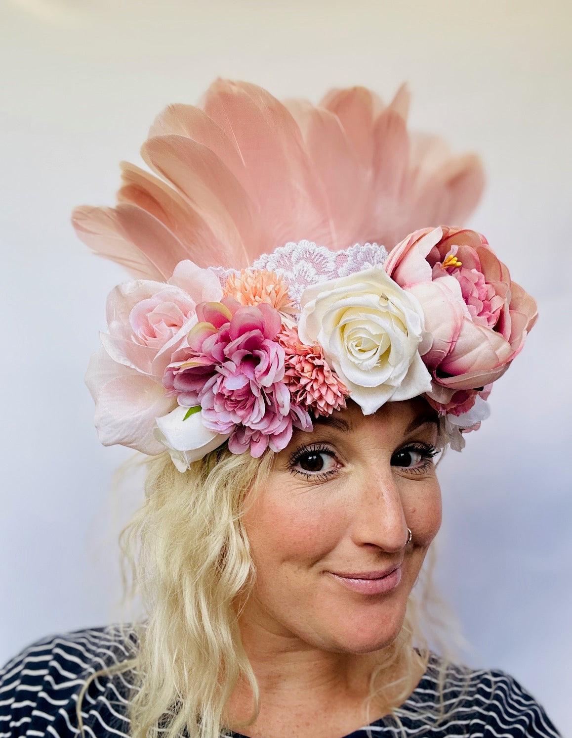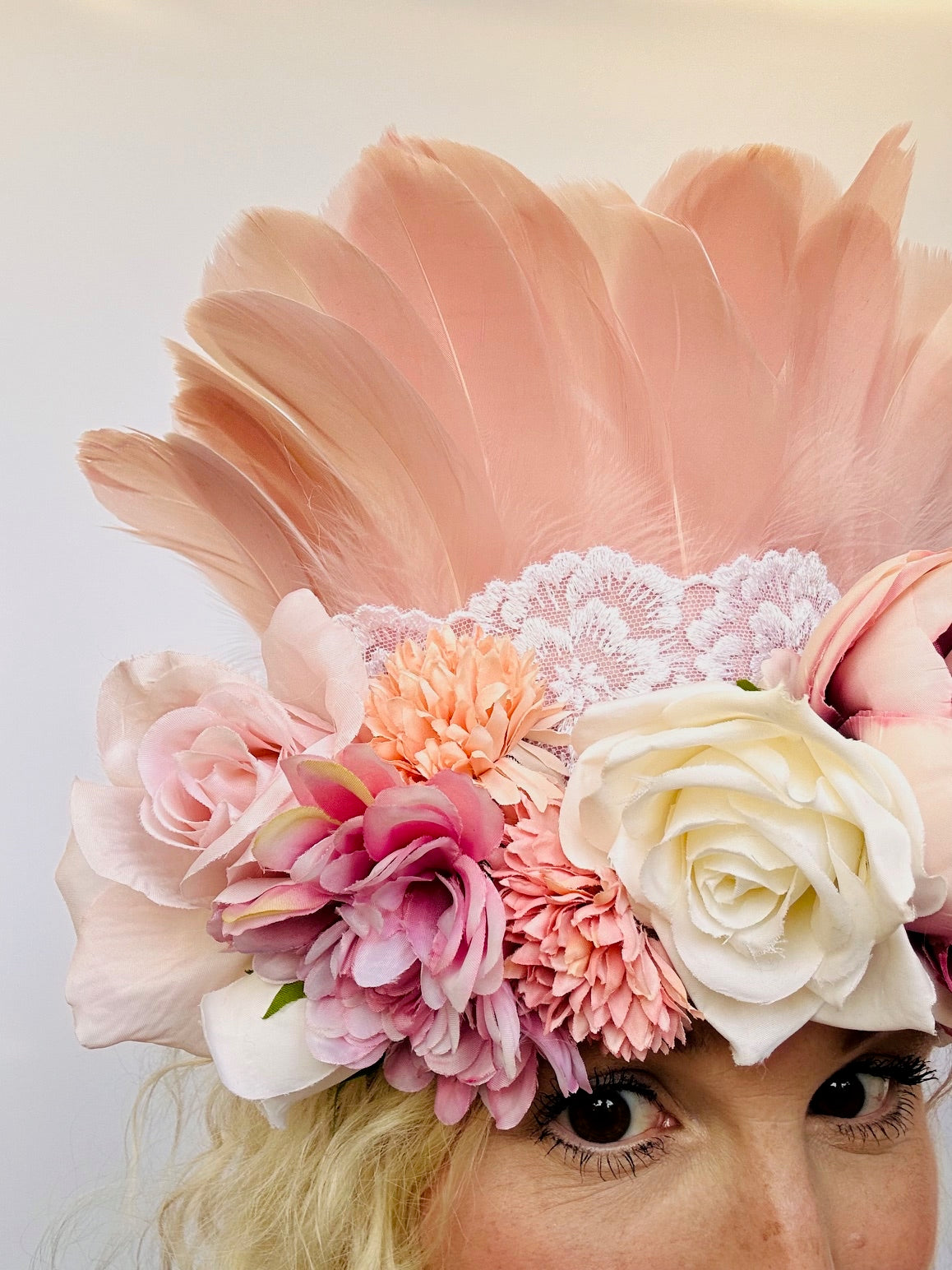 The gorgeous headdress is made with long dusky pink feathers, high quality artificial flowers, and delicate ornate lace.