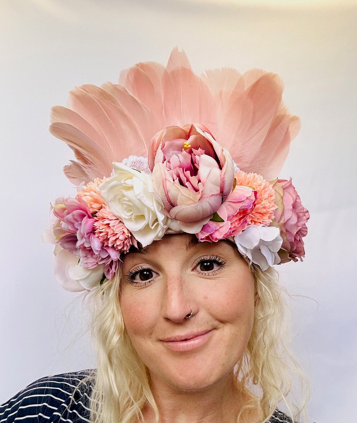 Your headdress will be made to order, so may not look exactly like the one pictured. It is likely to include peonies, roses and other dusky pink flowers.