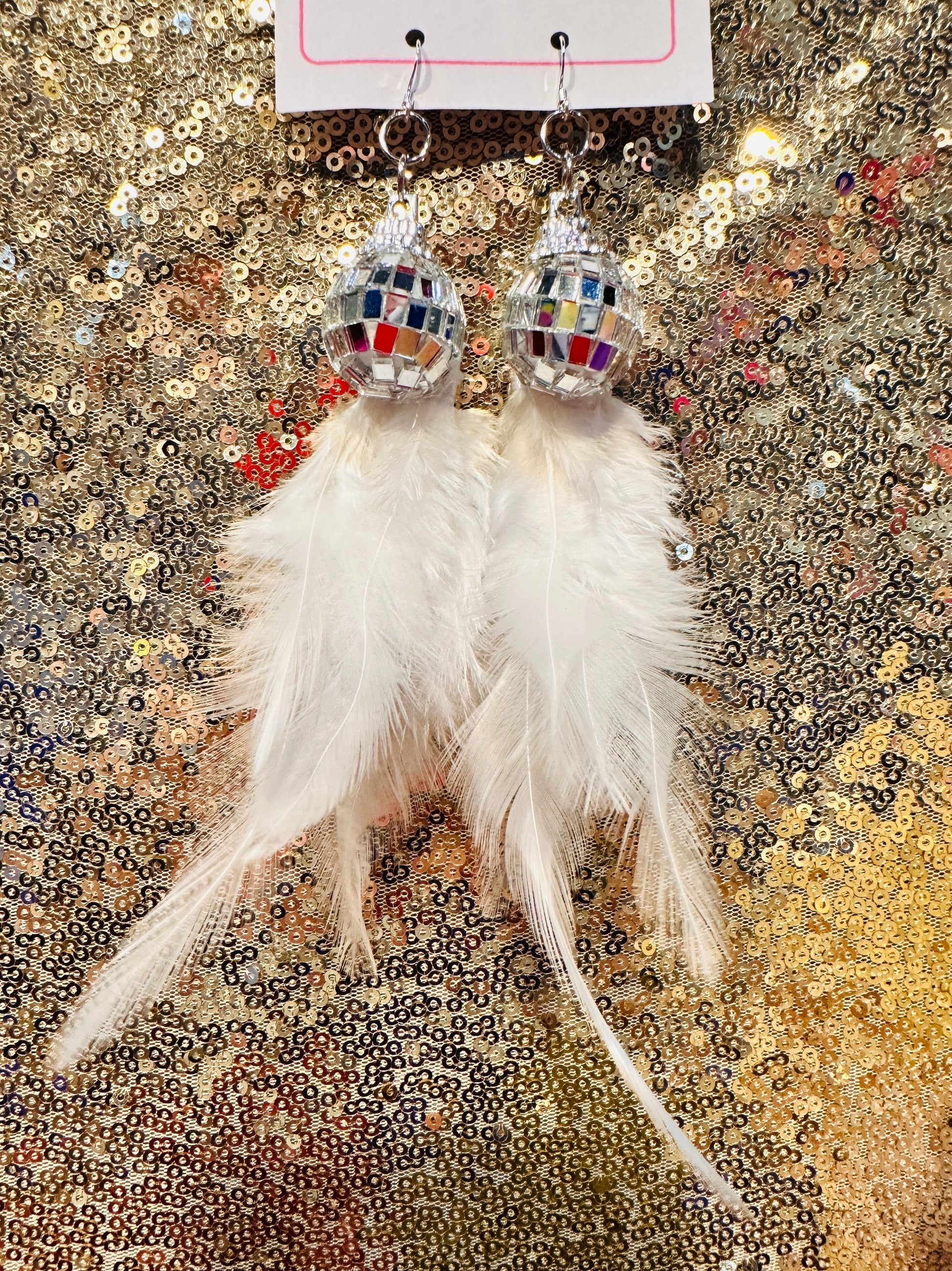 Ohh these are flashy! Mini disco balls with gorgeously soft feathers, on sterling silver hooks. Lots of colours available.