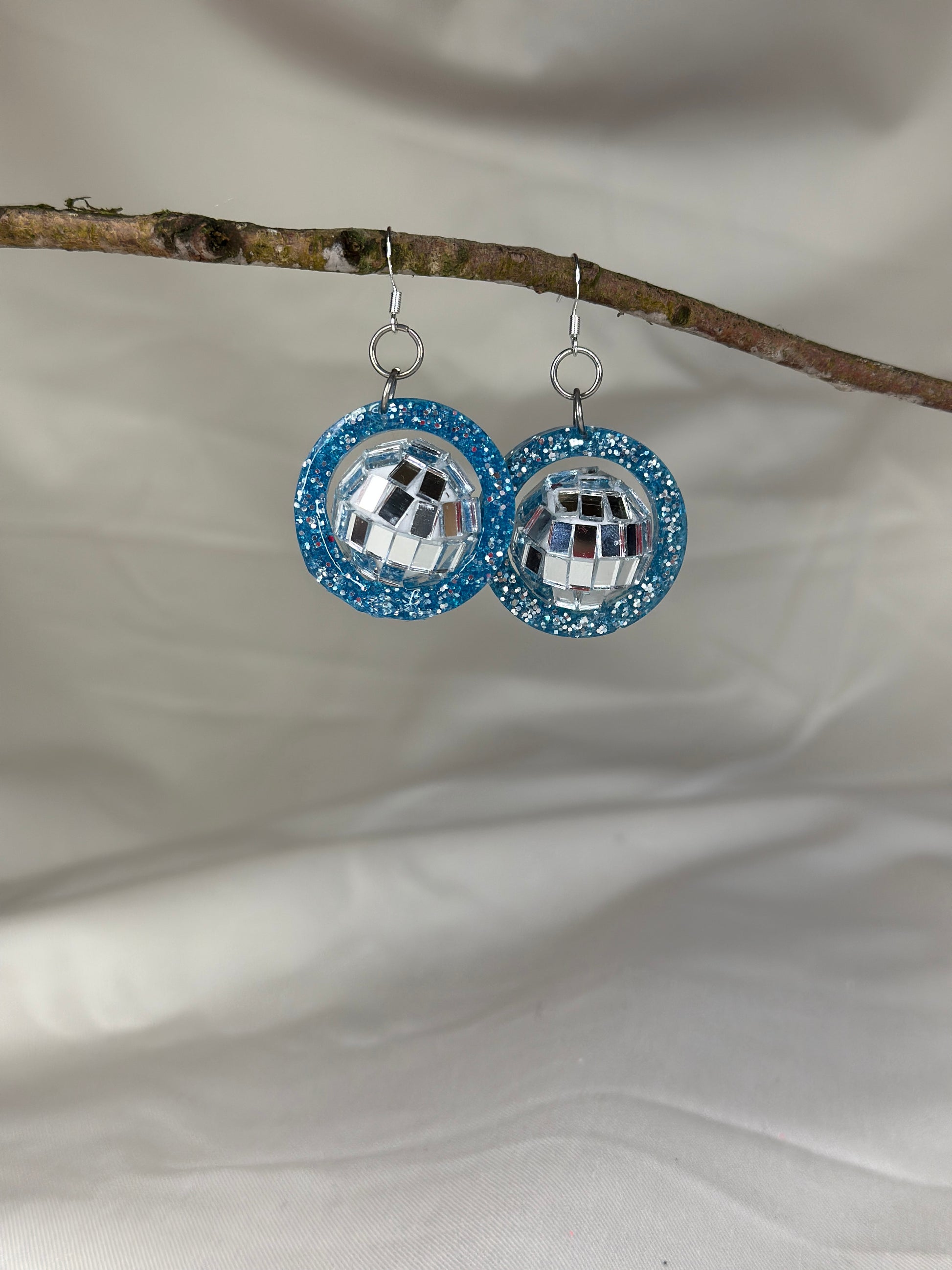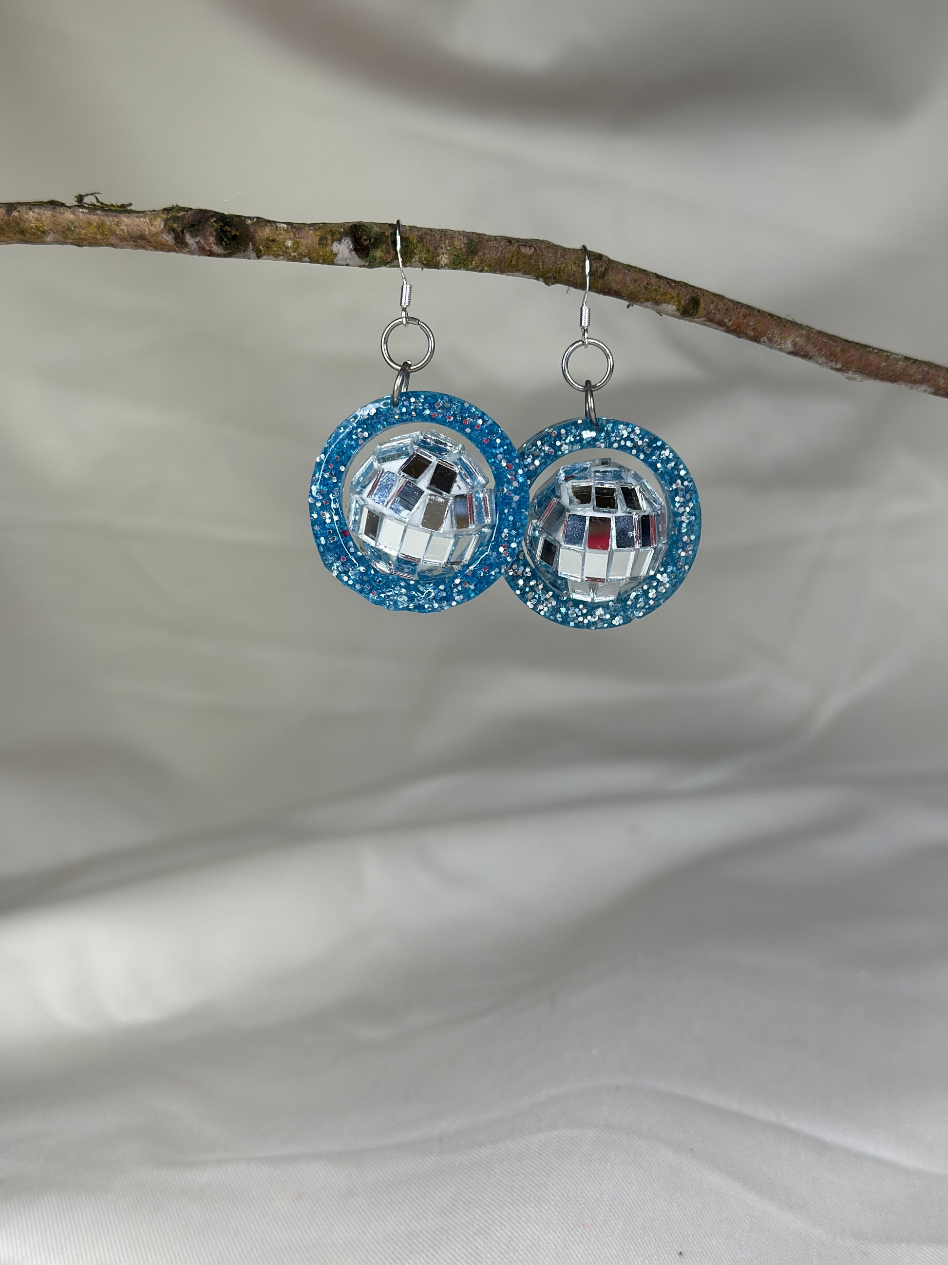 Handmade earrings with disco balls encircled in mega sparkly glitter blue resin.