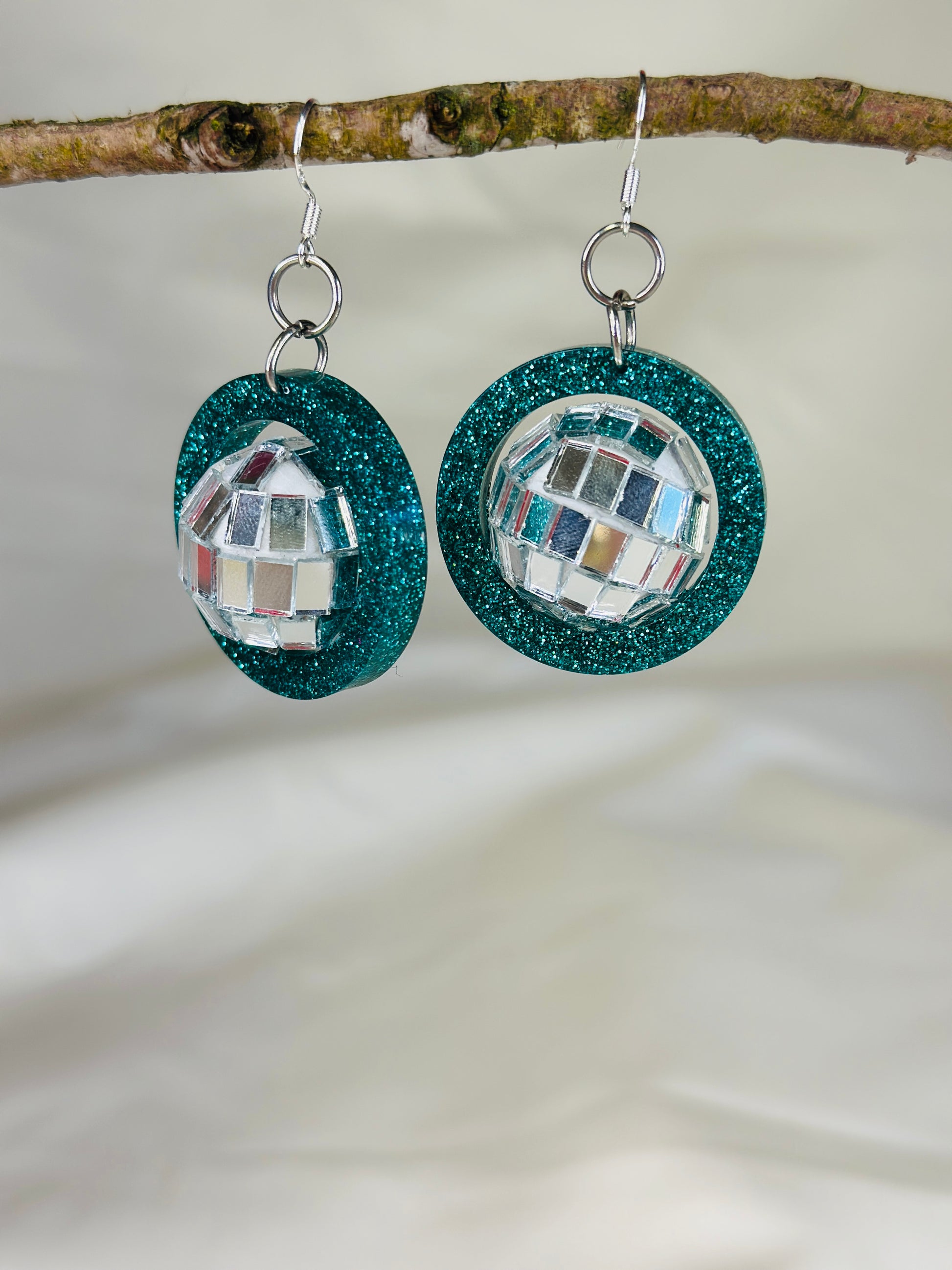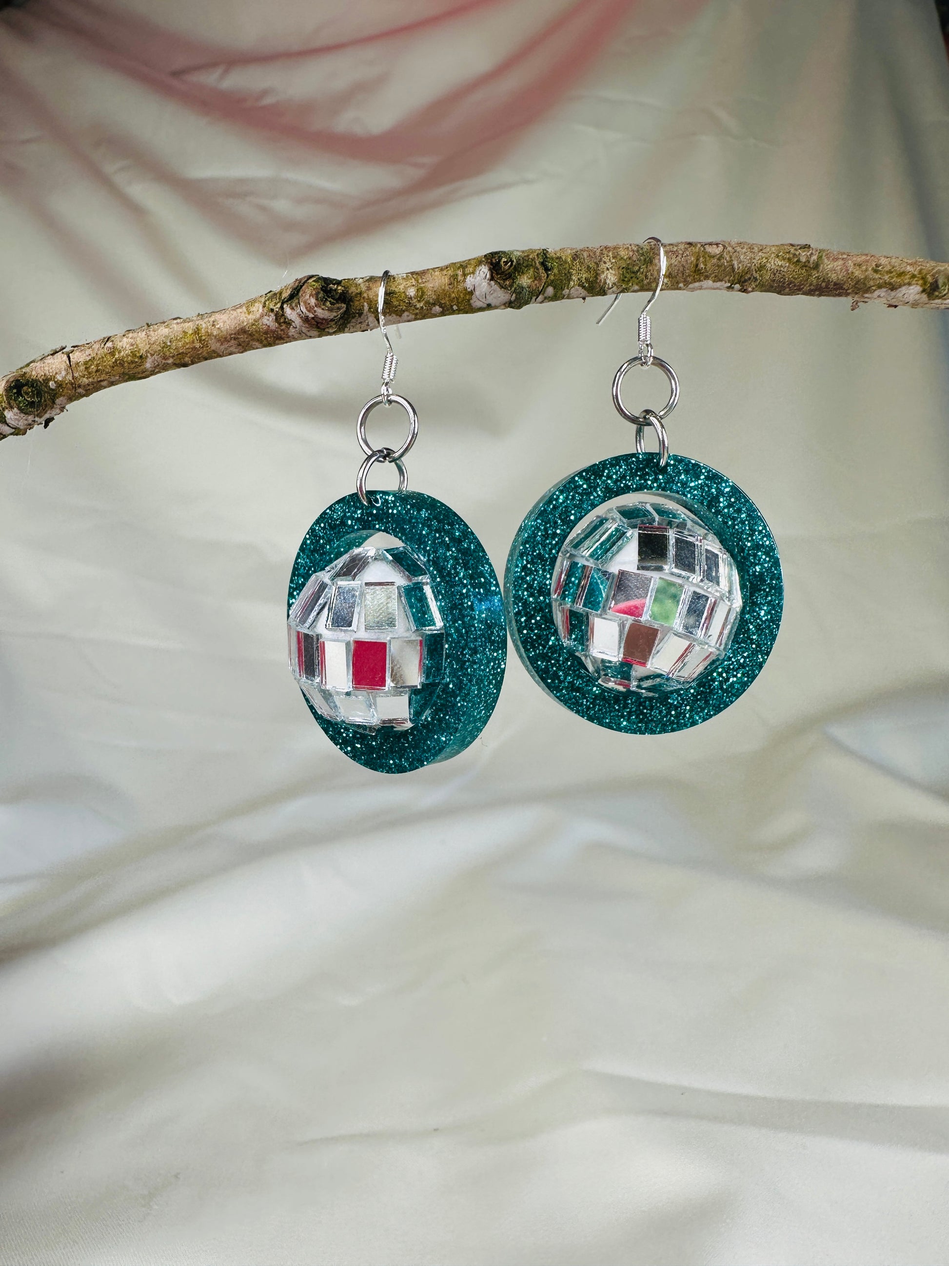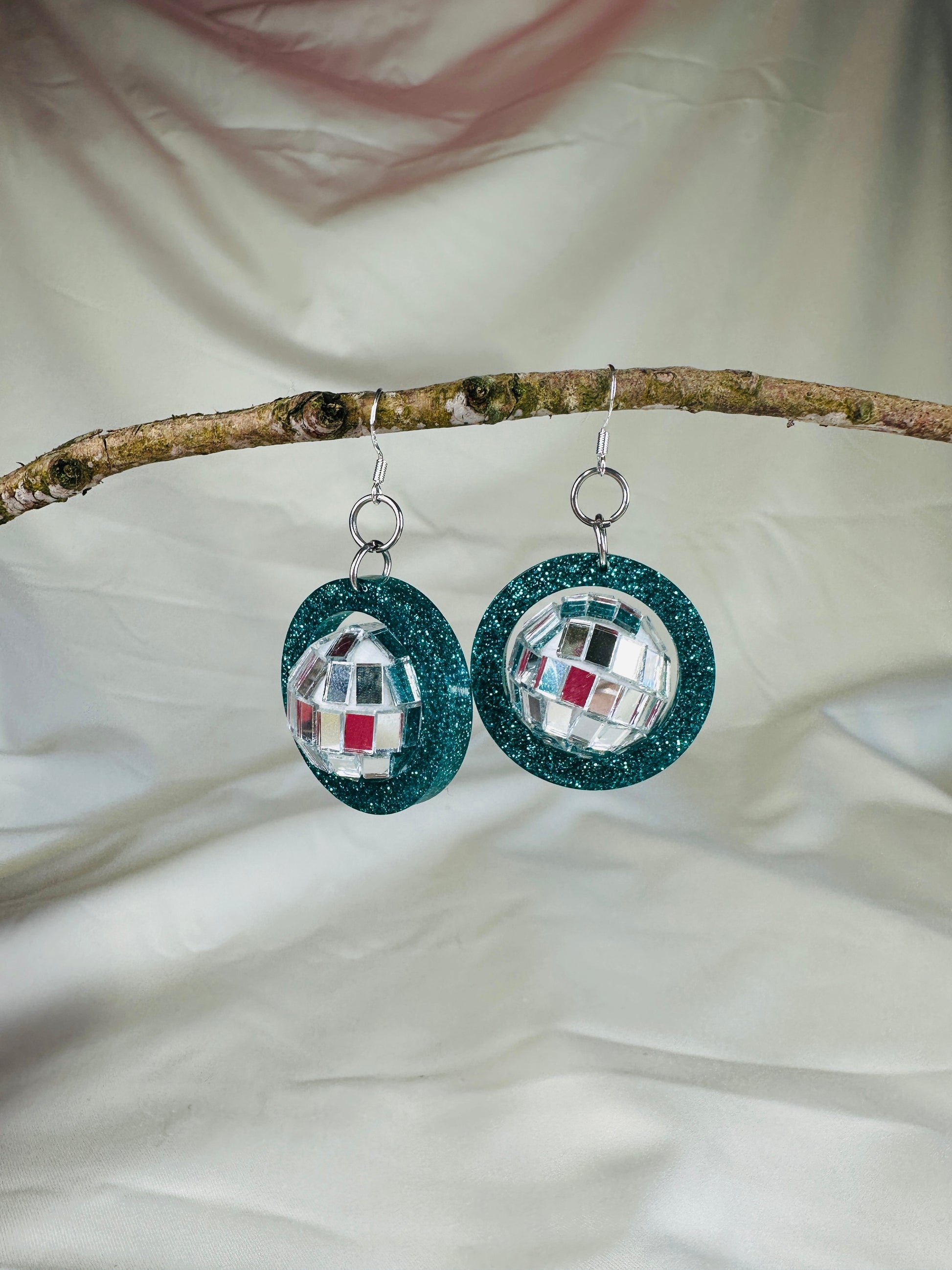 Handmade earrings with disco balls encircled in mega sparkly glitter green resin.