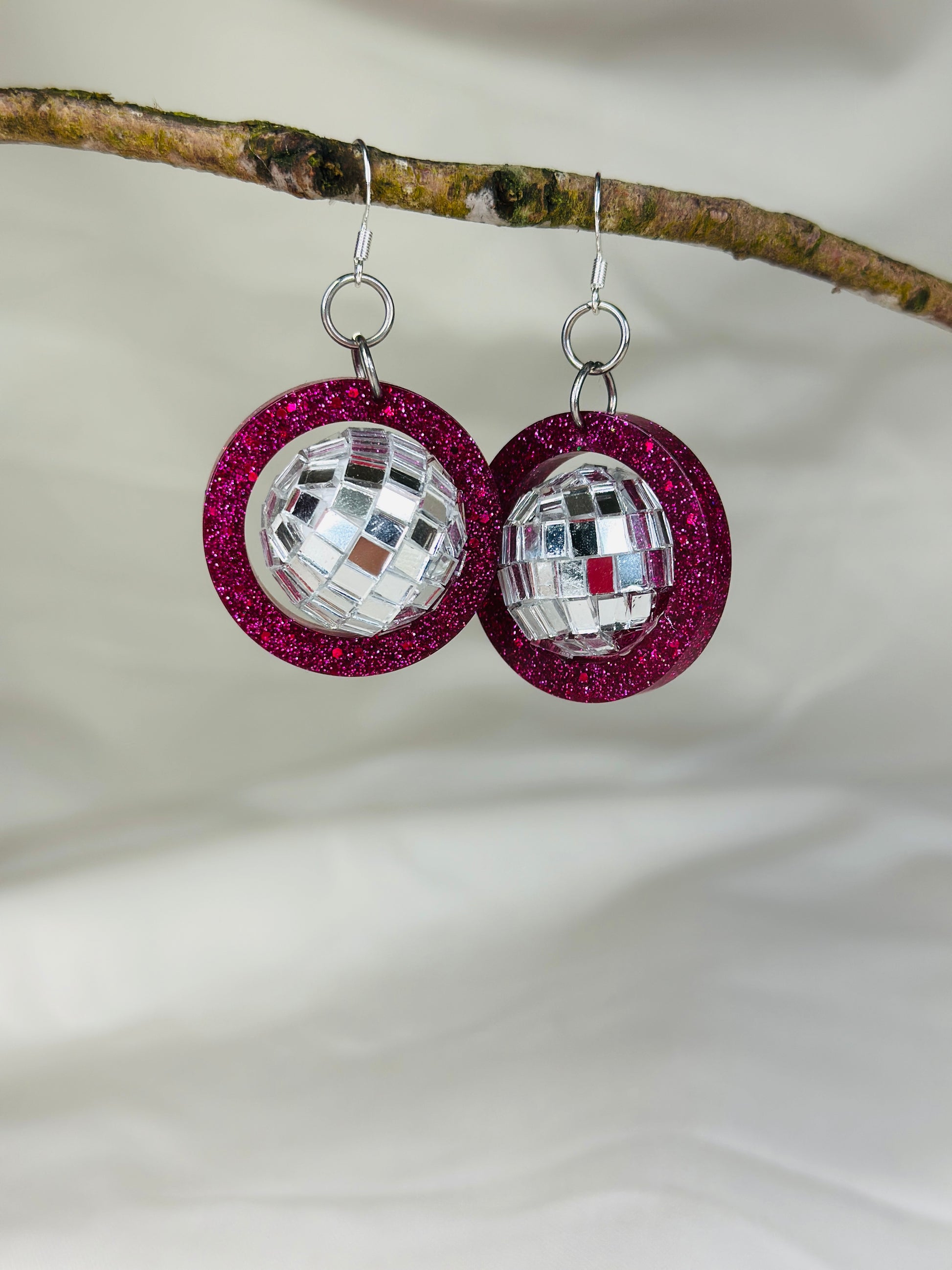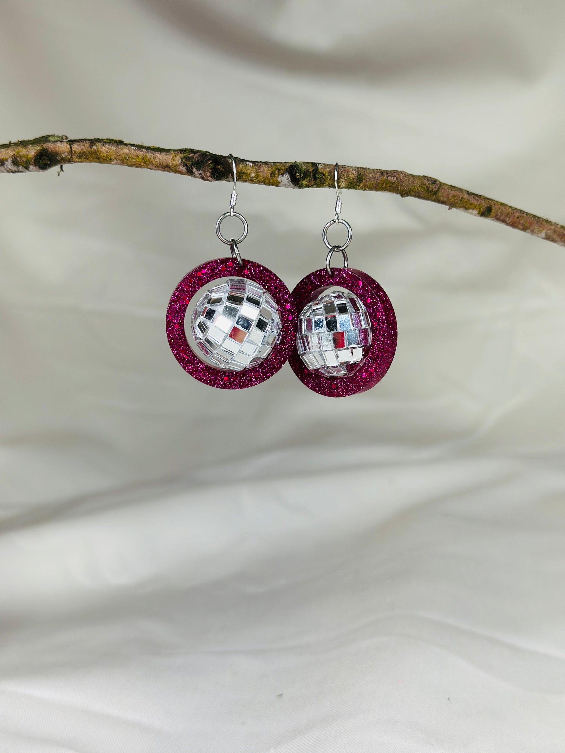 Handmade earrings with disco balls encircled in mega sparkly glitter pink resin.