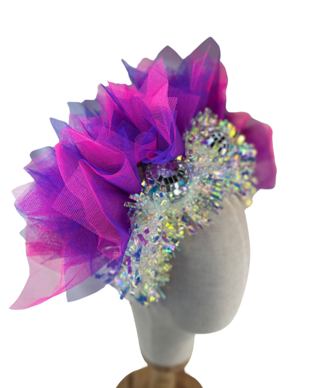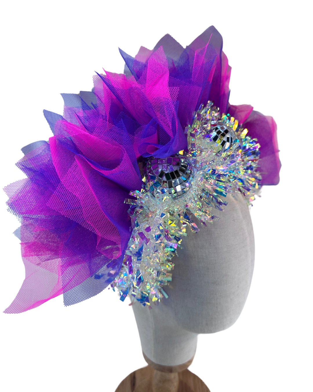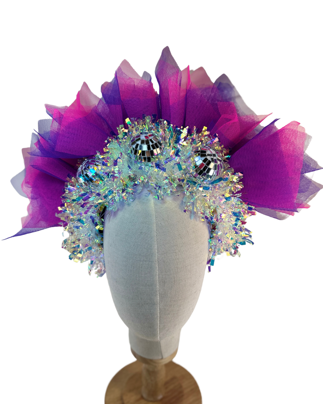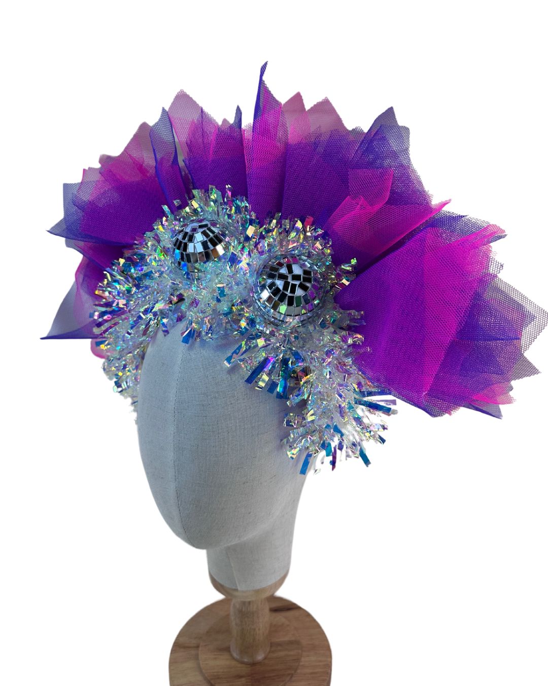 This disco ball net headband is handmade with three disco balls, sparkling tinsel and pink & purple net attached to a padded headband. This headband looks incredible under UV lights (see last photos).
