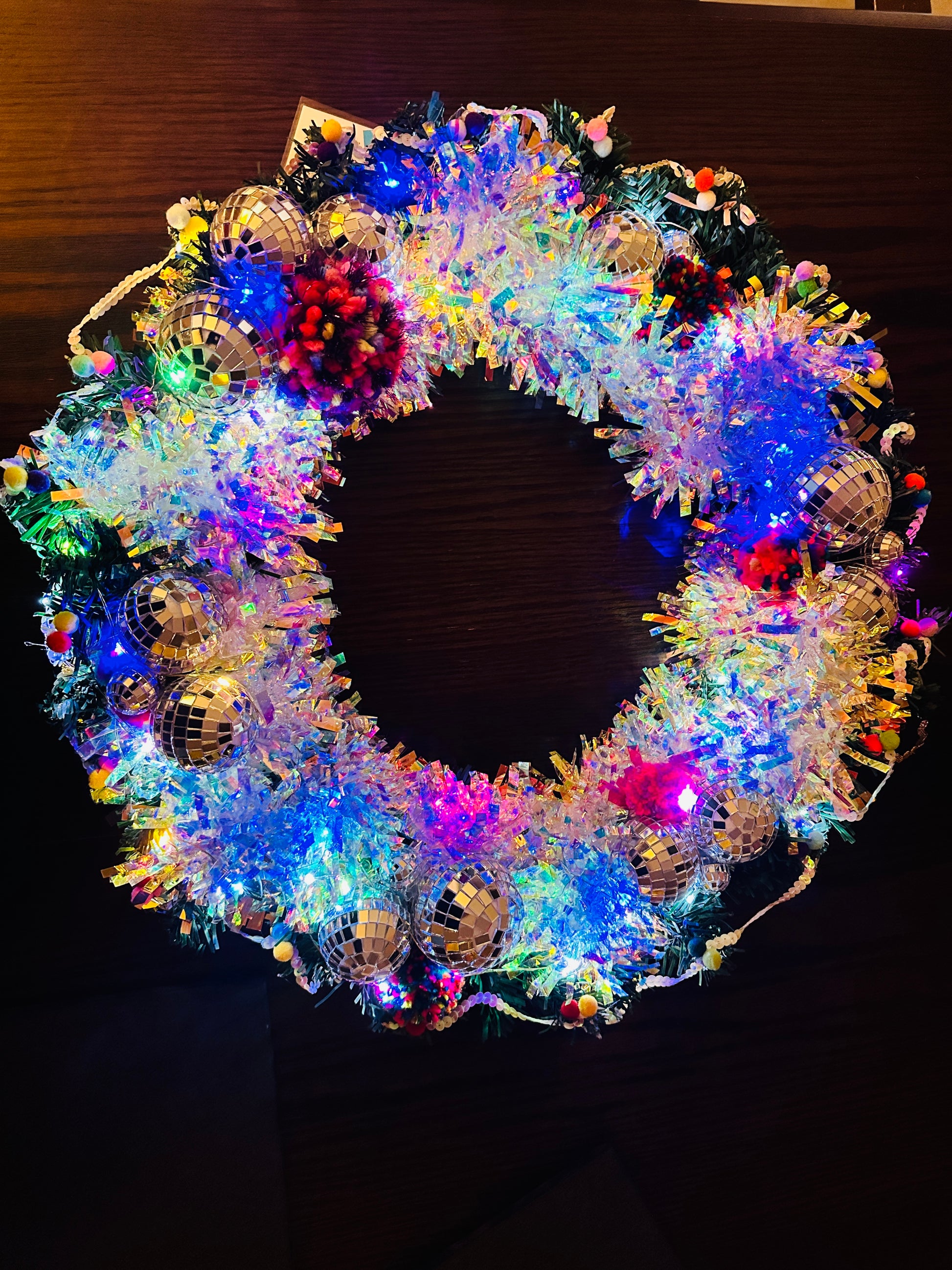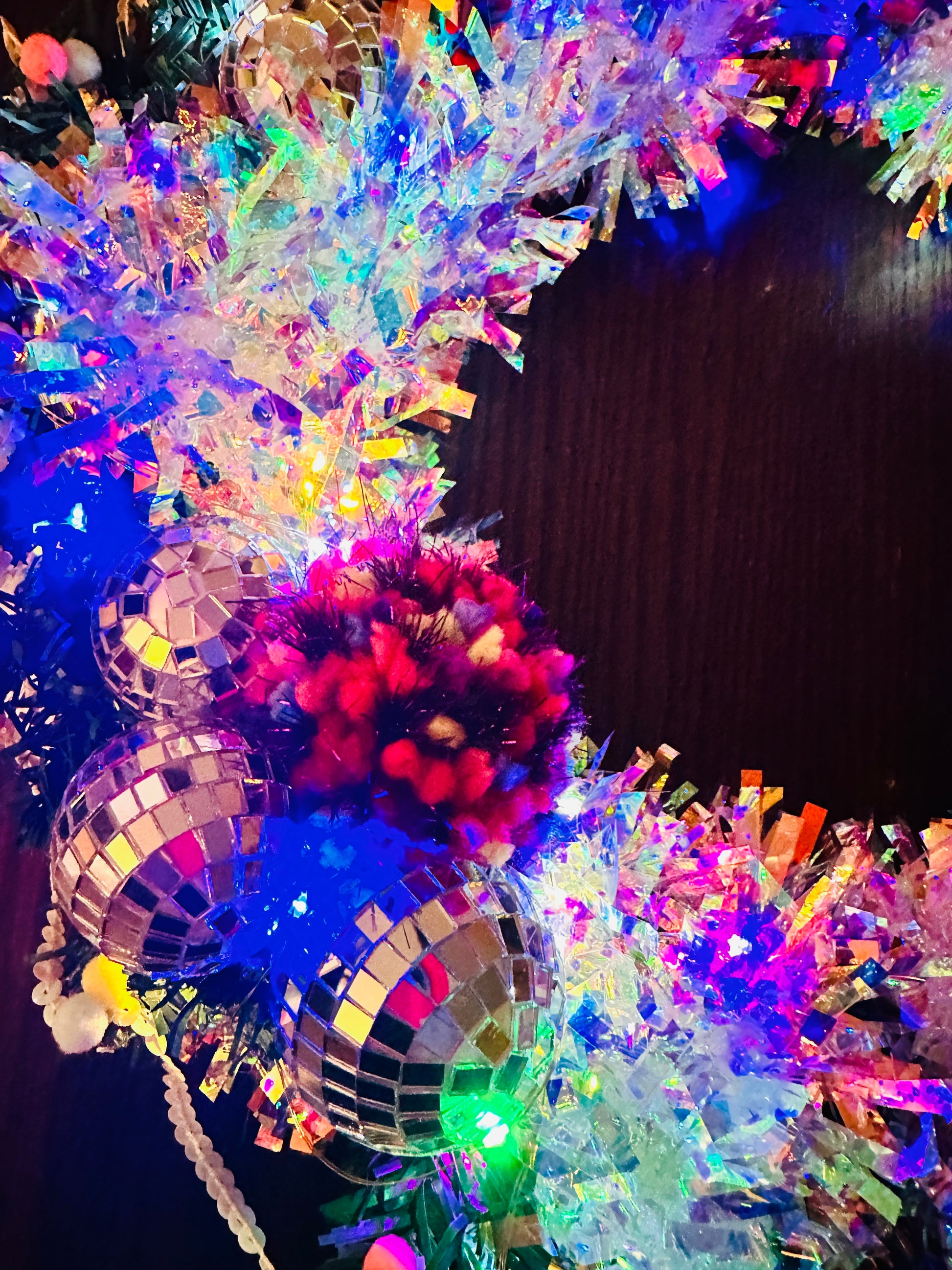 It’s large, a mix of classic green foliage, disco balls, hand made pom poms, lights, and wonderful sparkle!