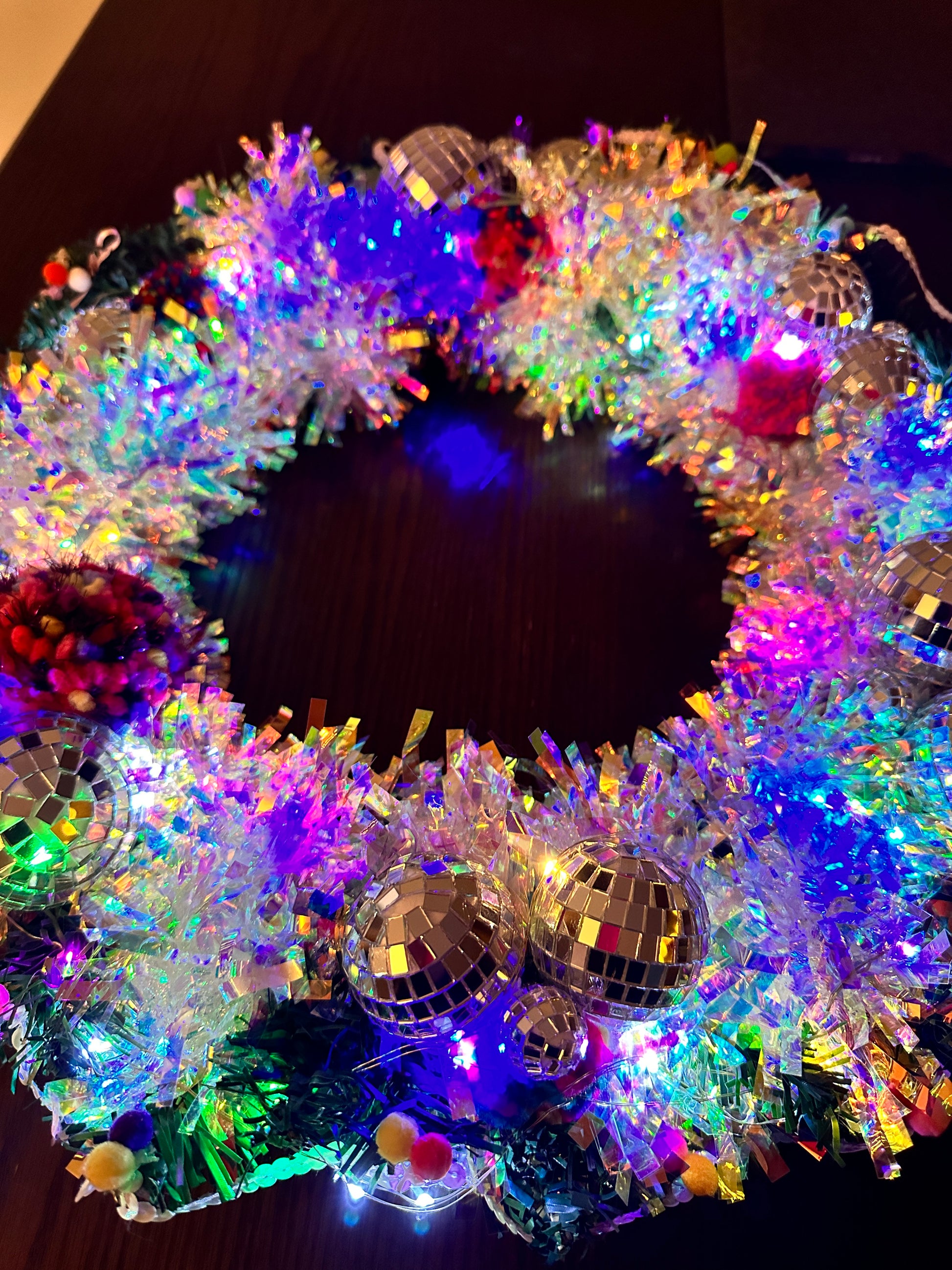 This wreath takes inspiration from a custom, where I was asked to make the ‘campest ever wreath’, as a result, the Disco Boogie wreath was born!
