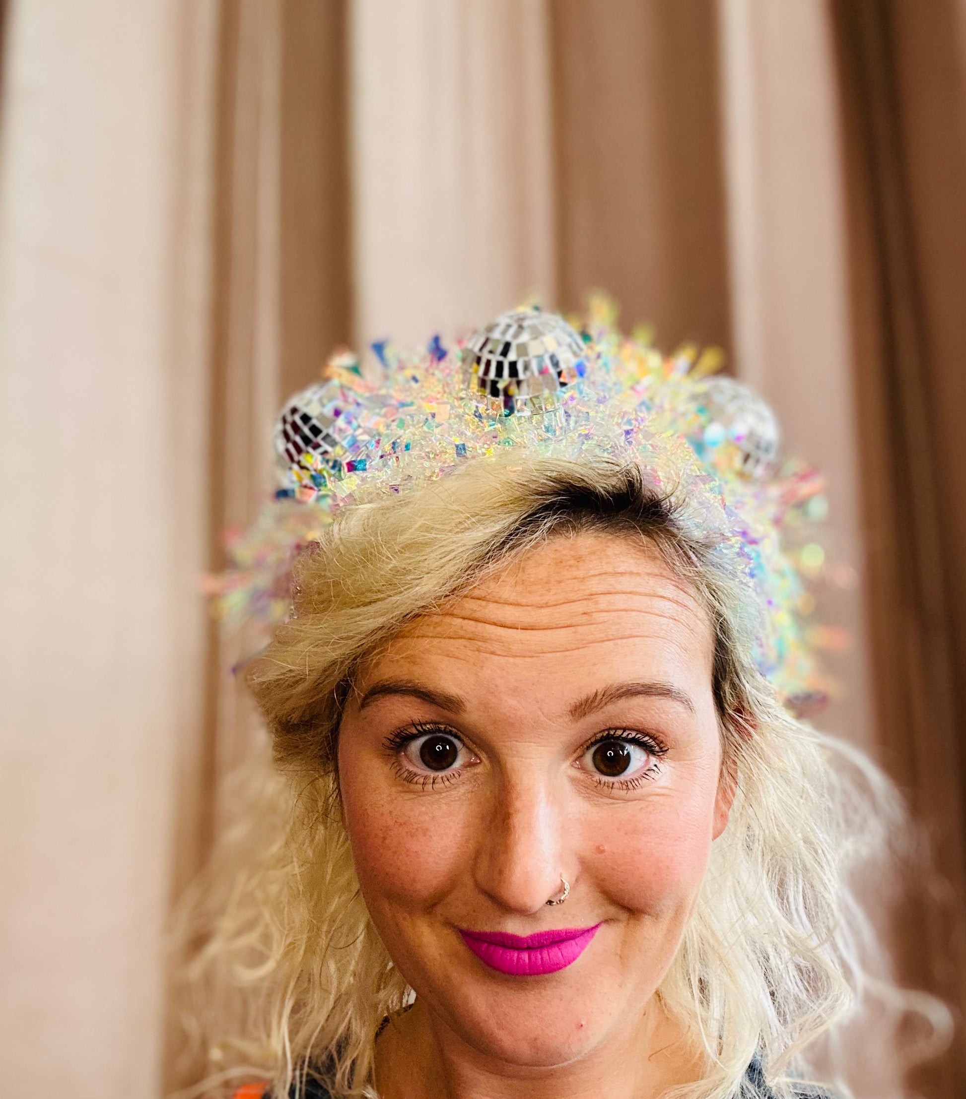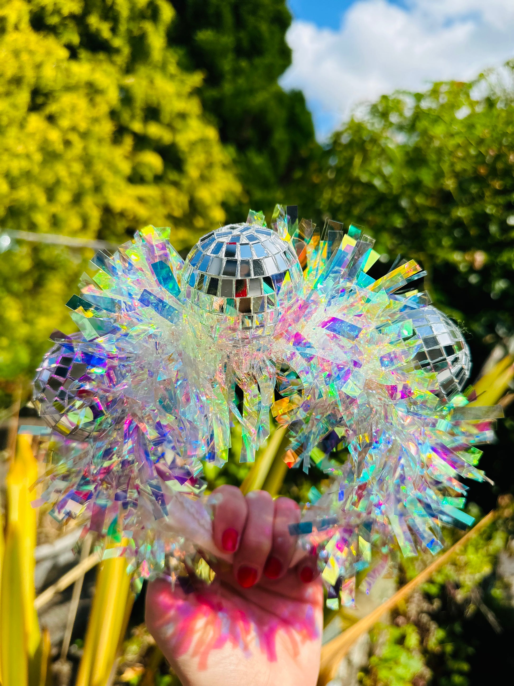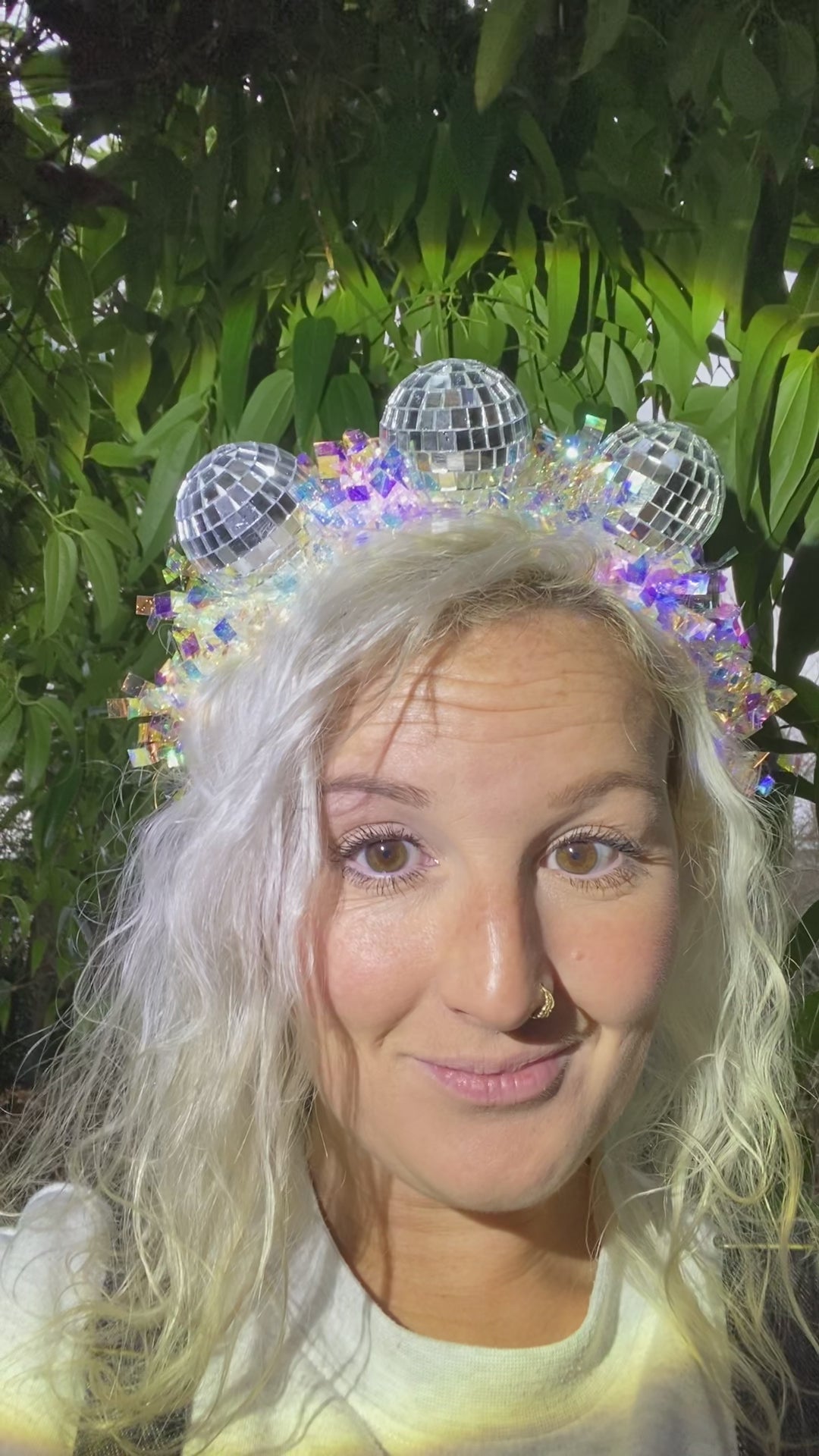 This headband is full of sparkle! Luxurious iridescent tinsel teamed with three disco balls on a padded headband.