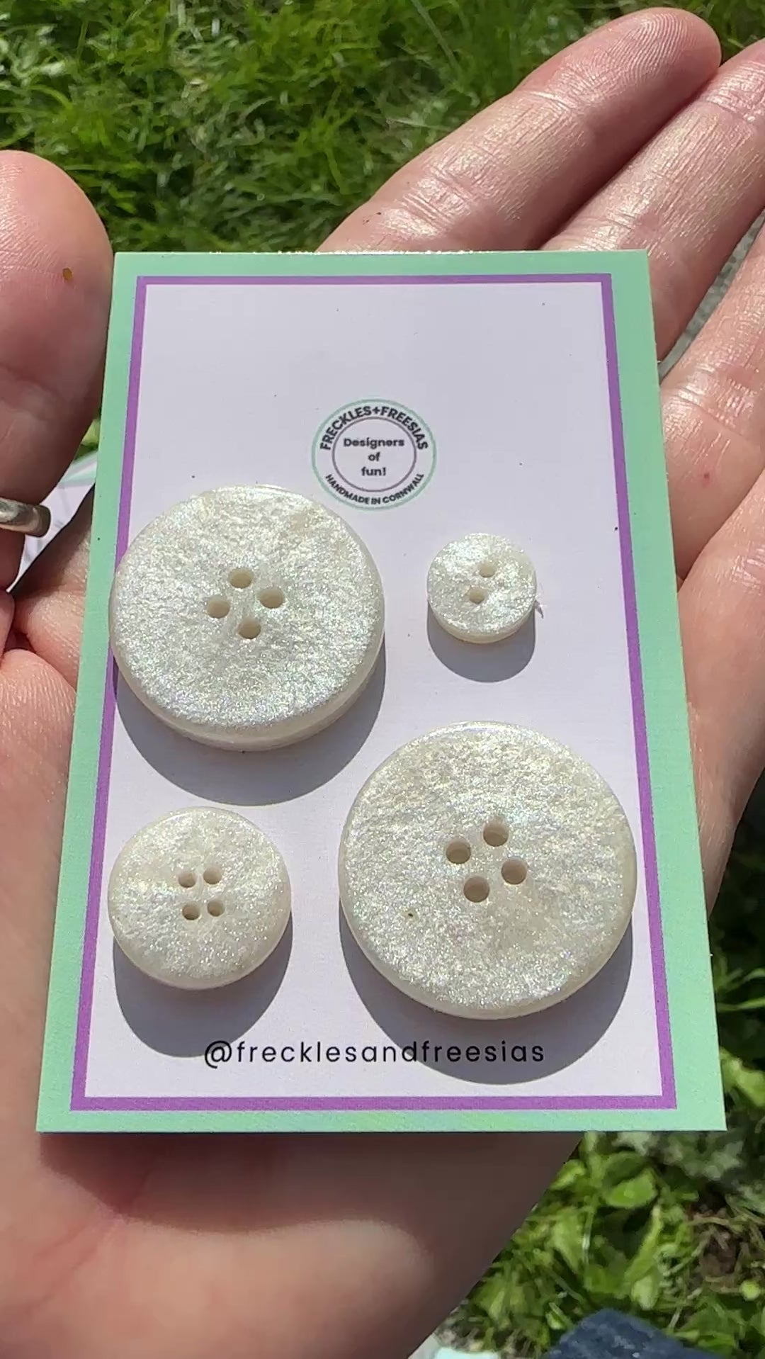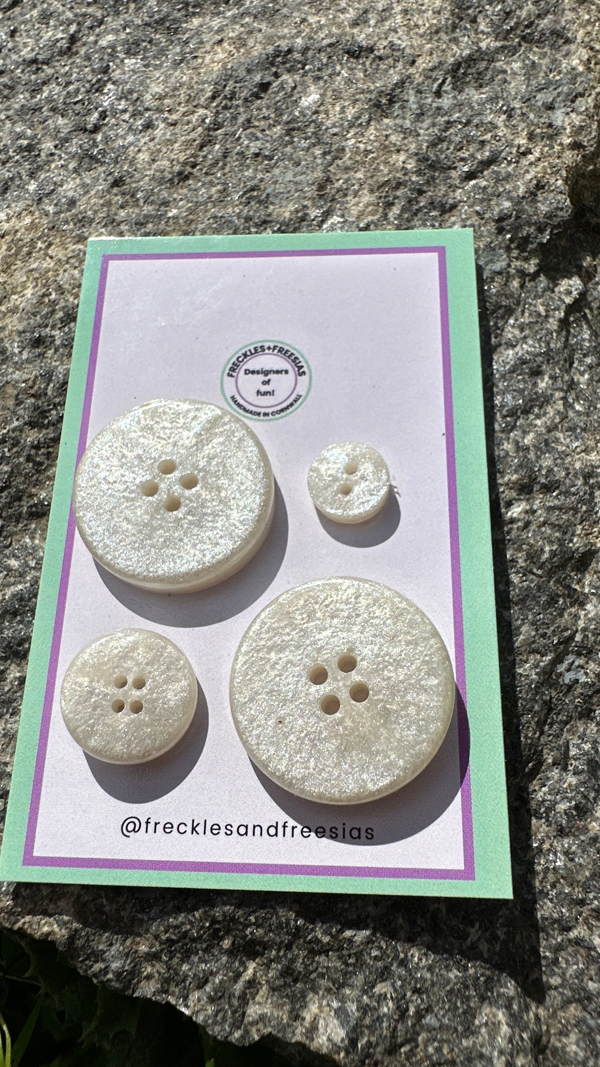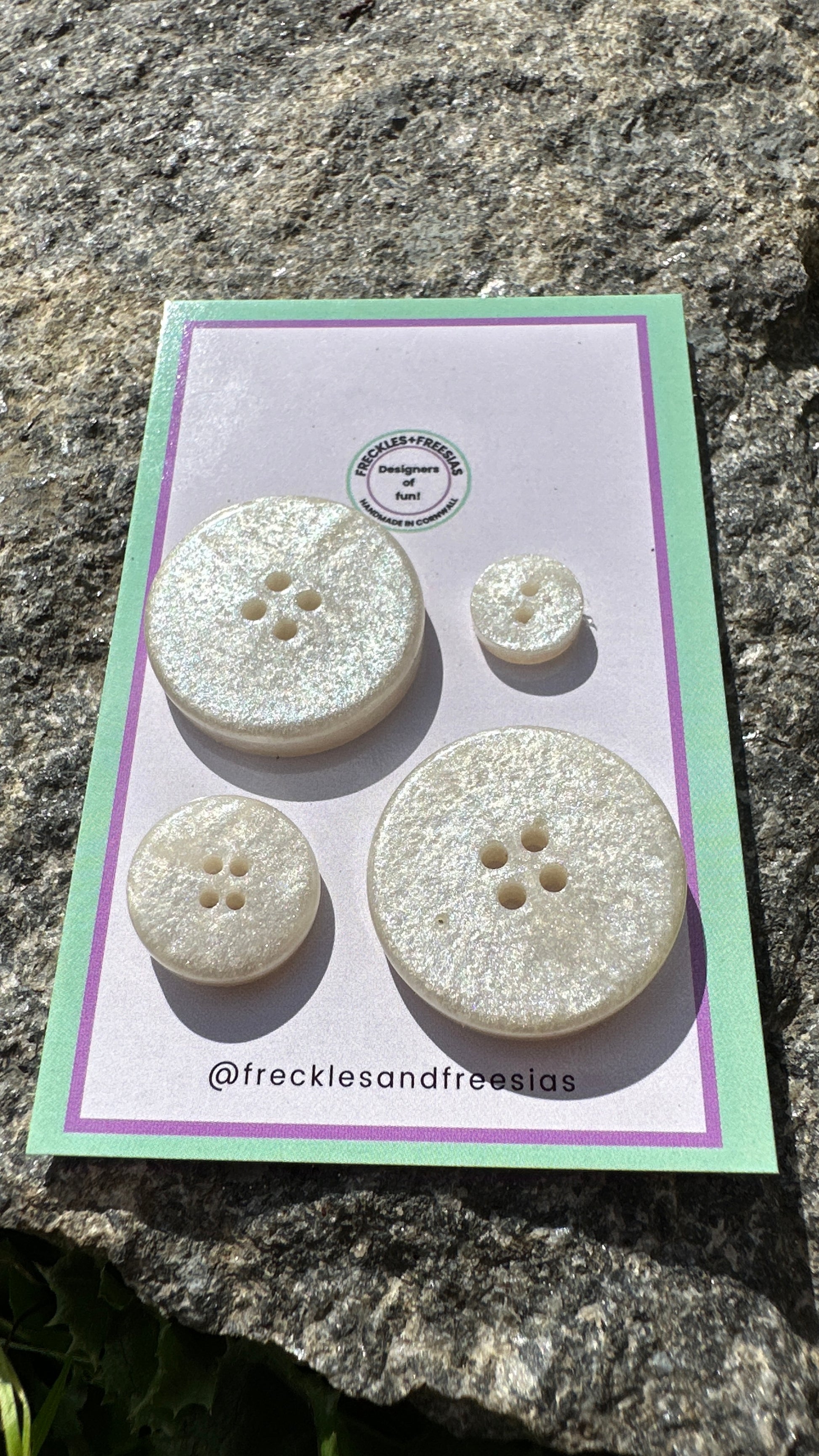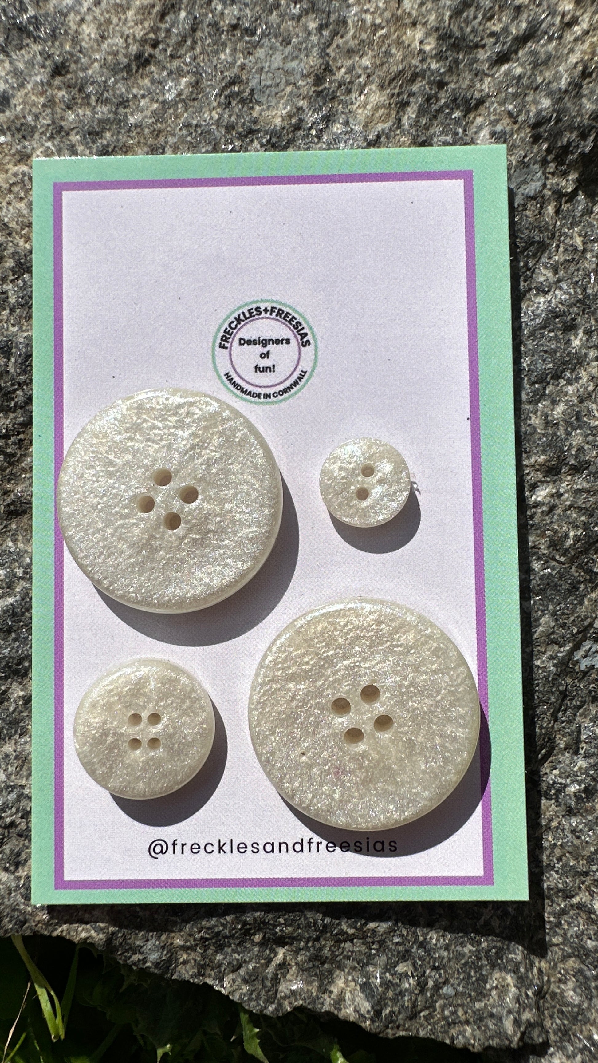 Handmade resin buttons white pearlescent iridescent glitter, bright, fun, round, children’s, kids, 1cm, 1.2cm, 2cm, 2.5cm, 10mm, 12mm, 15mm, 20mm, 25mm