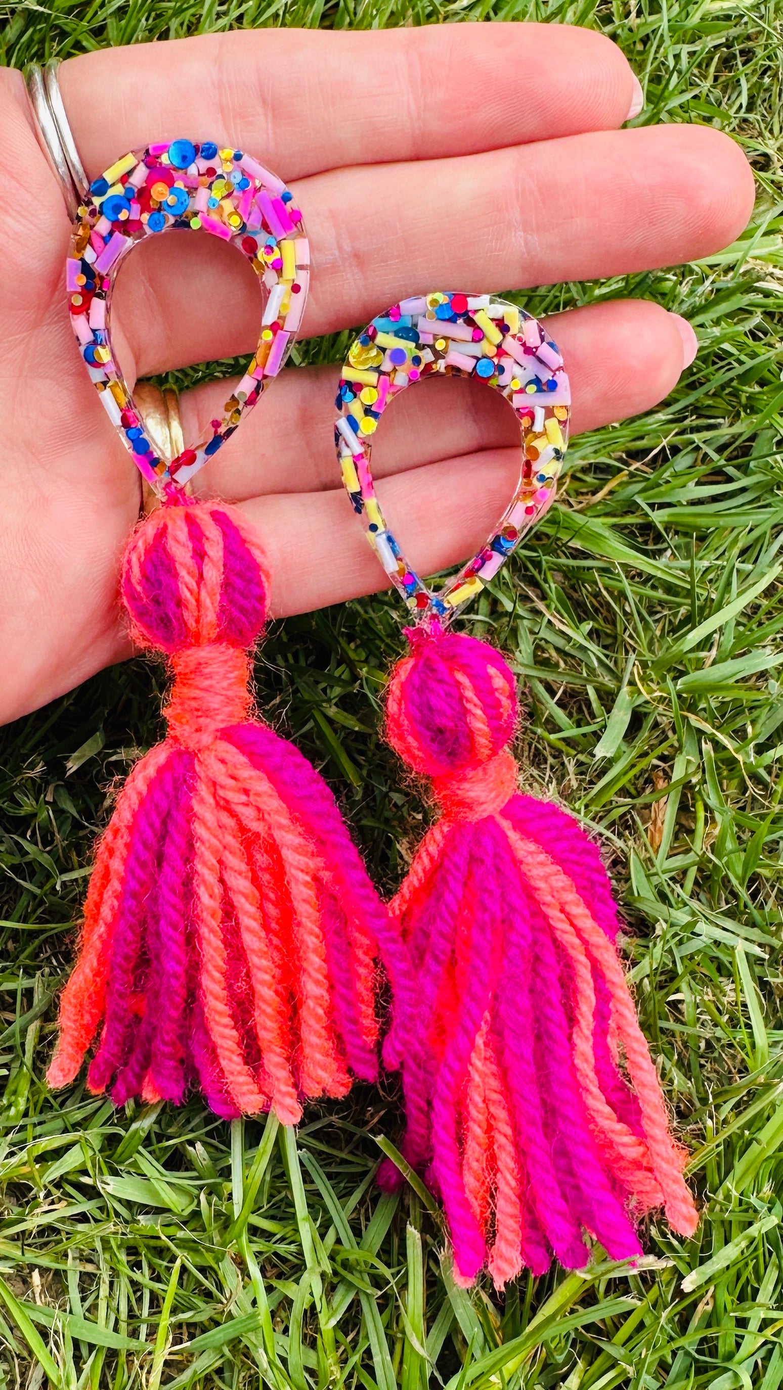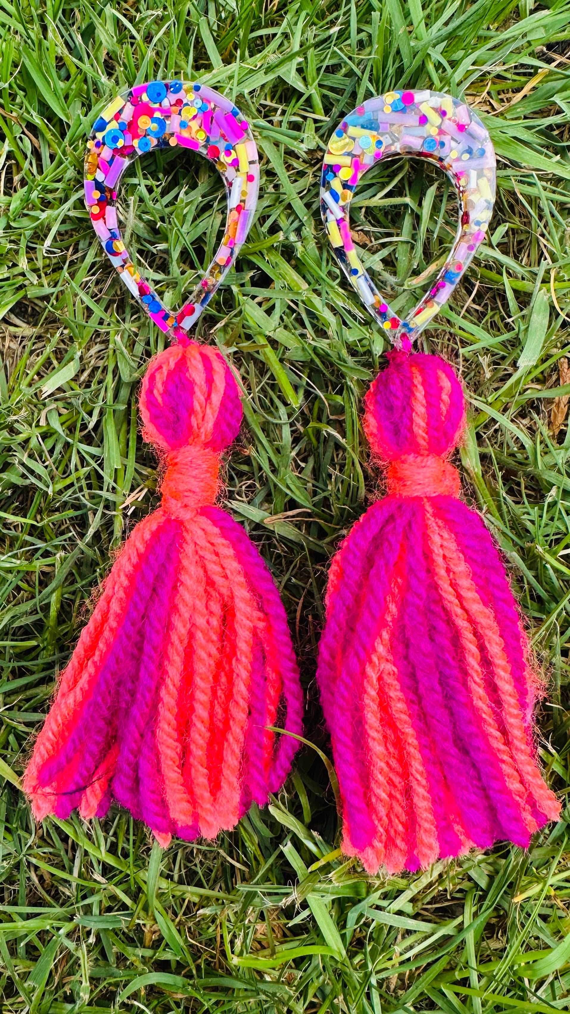 Handmade tassel resin earrings in bright magenta & coral with sprinkles and glitter
