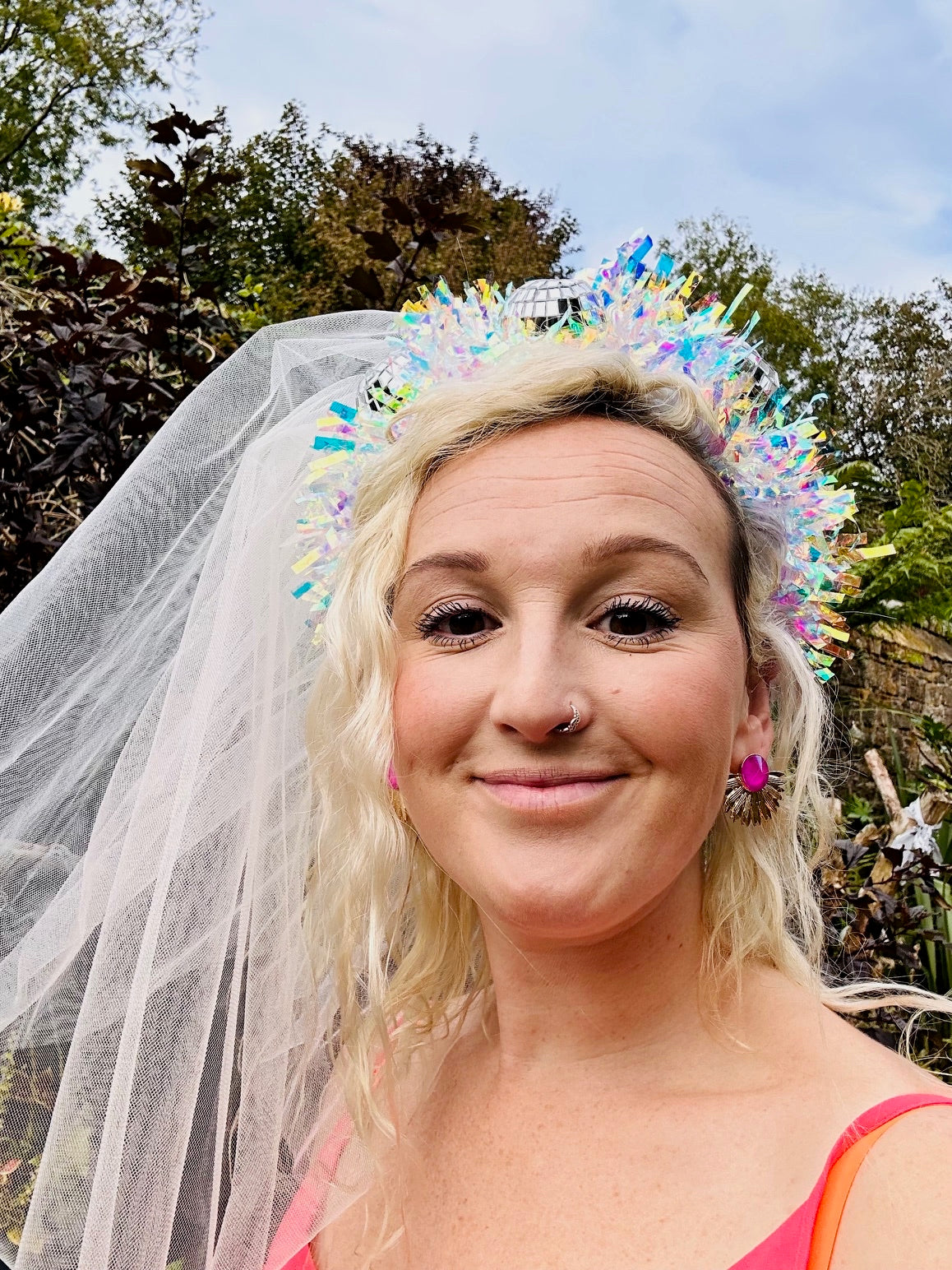 This headband is based on our best selling Disco Time! headband, but I’ve added a gorgeous sparkly white veil for the soon to be bride!
