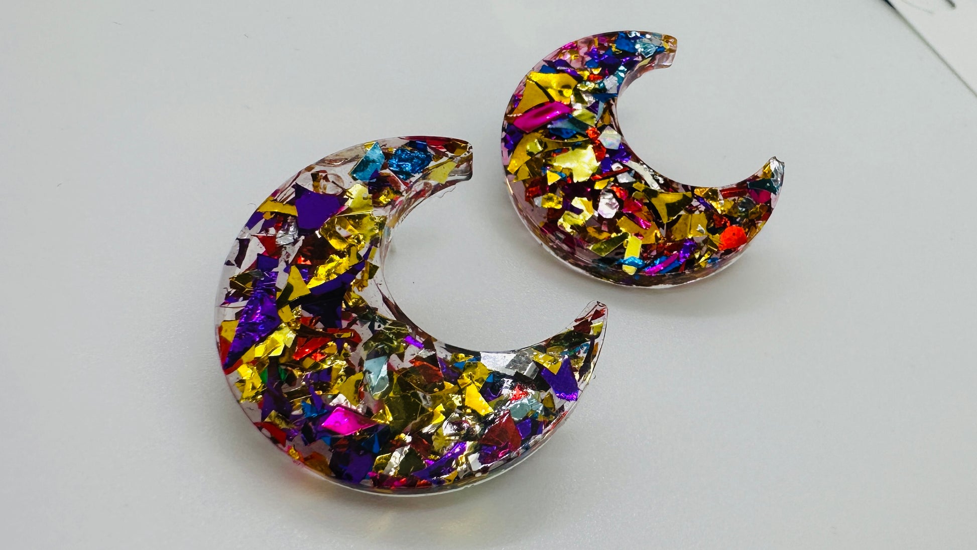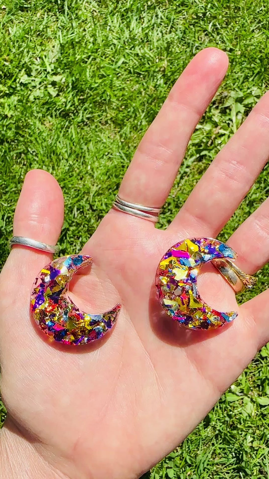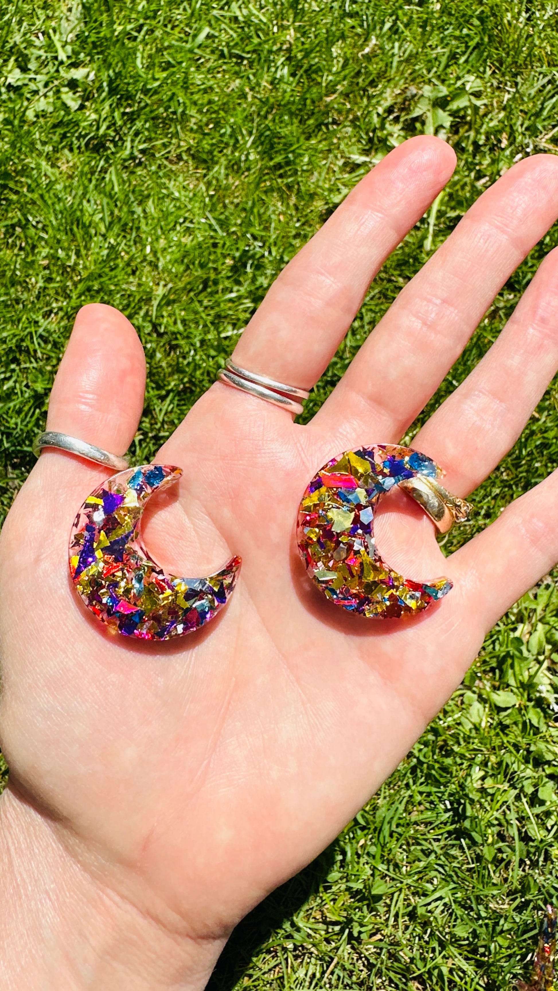 These are so sparkly! Chunky mixed colour glitter moon earrings with sterling silver studs.