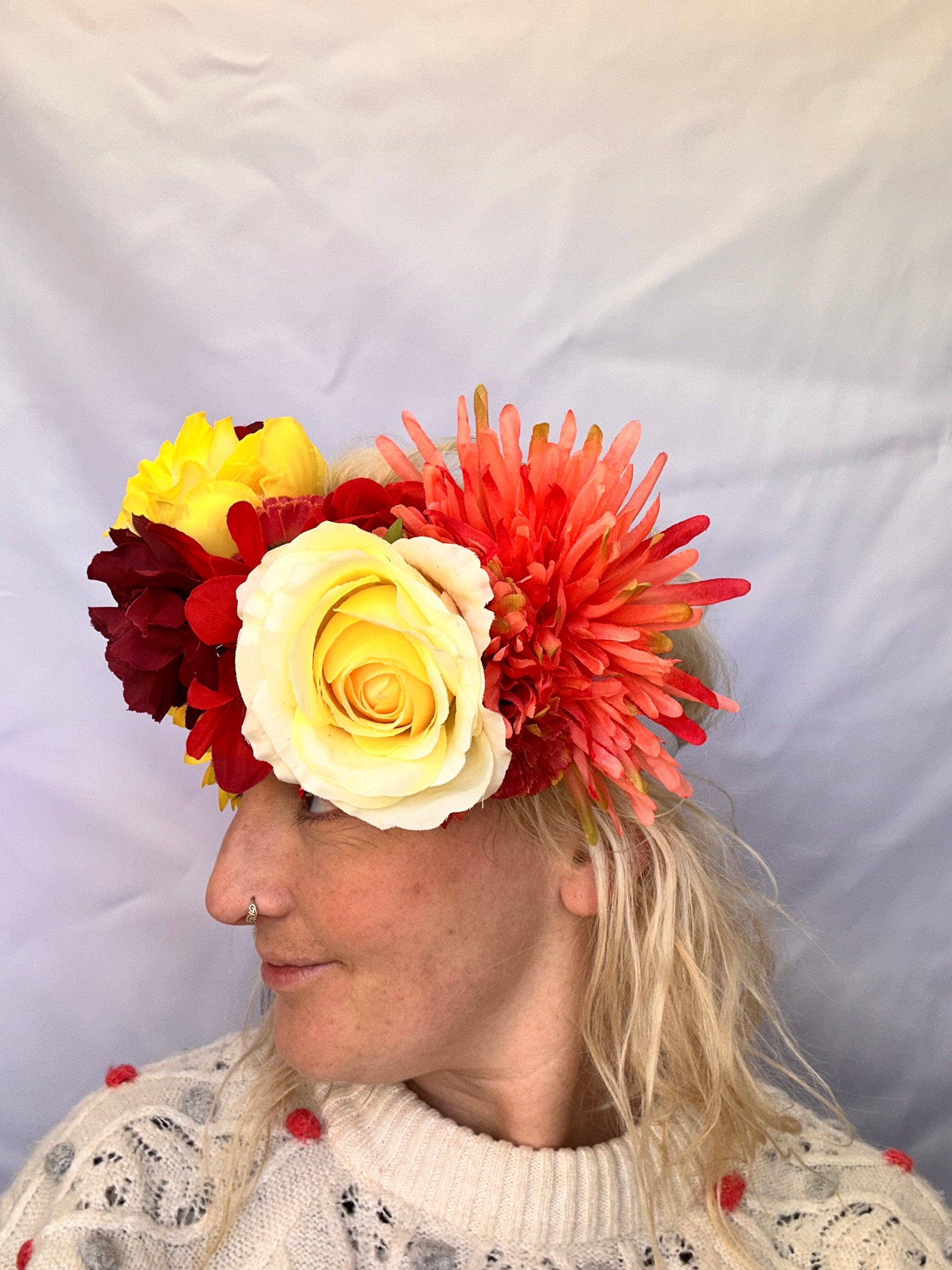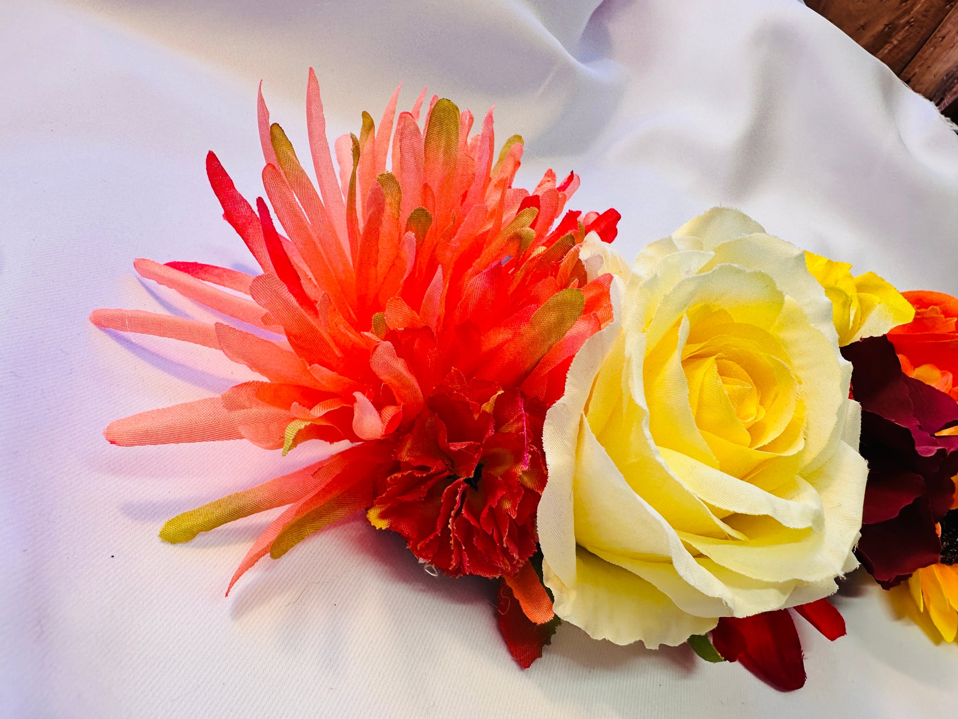 This flower crown features stunning sunrise colors of red, orange, and yellow flowers. Every crown is carefully crafted by hand, so the final product may have slight variations from the image shown. However, you can be certain that it will still exude the same beautiful sunrise vibes!