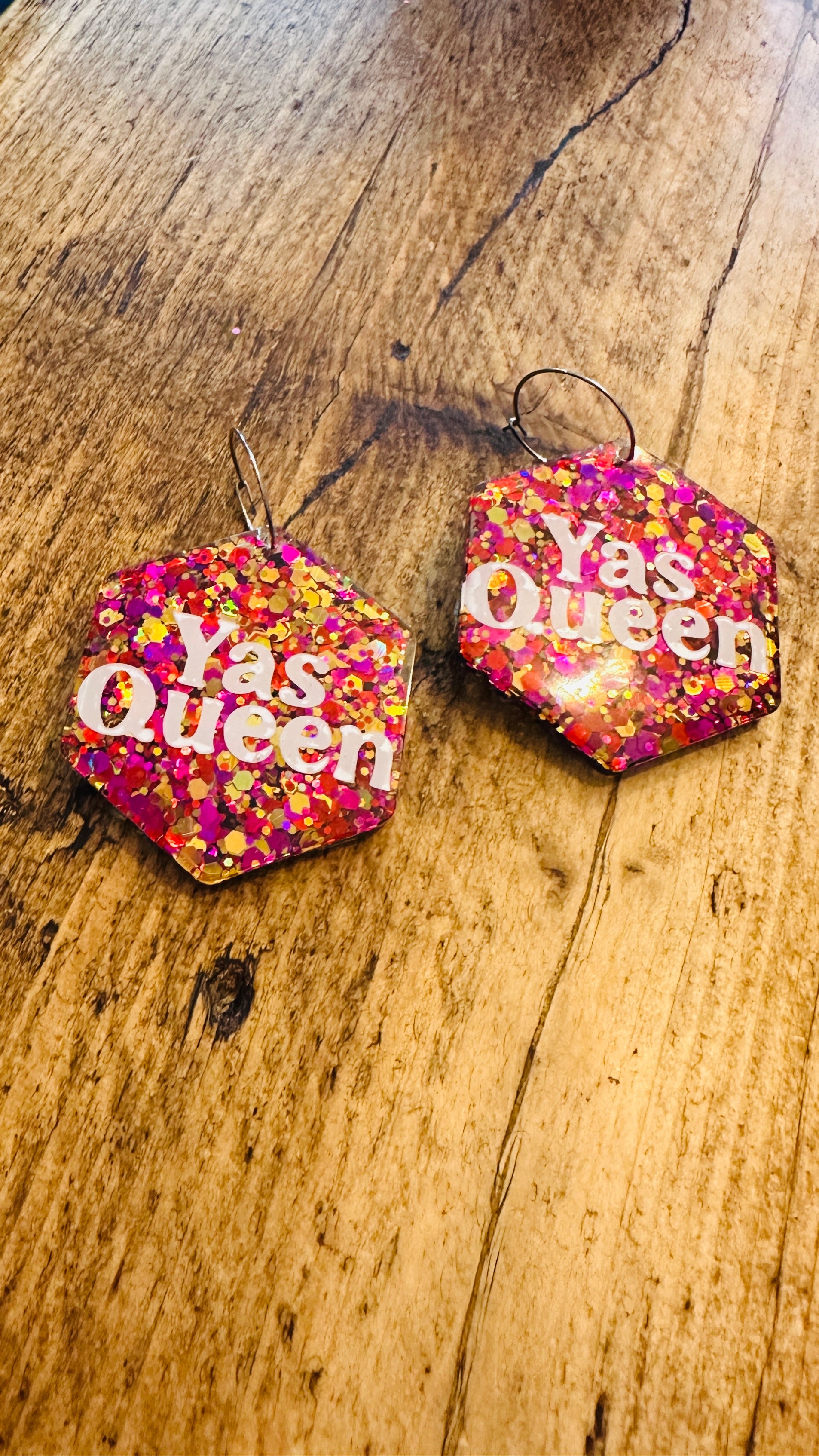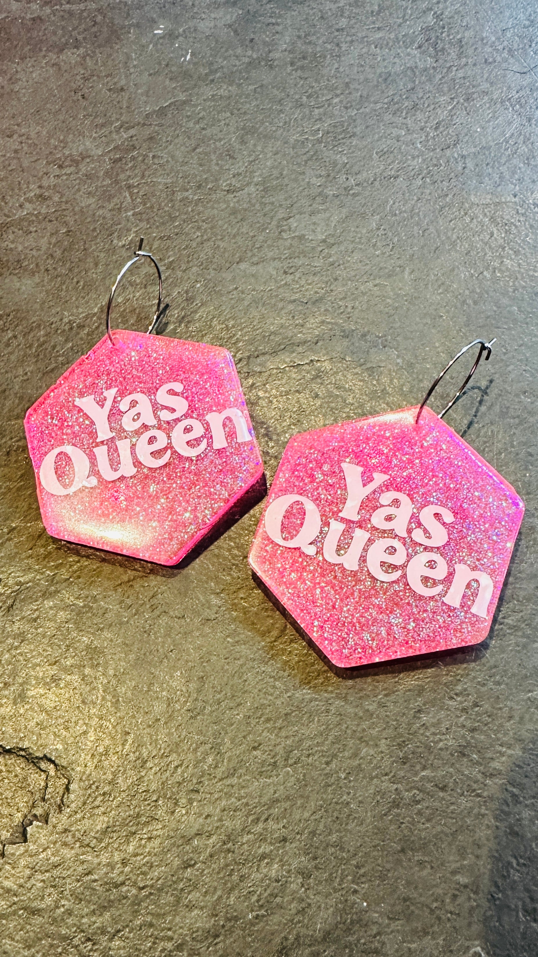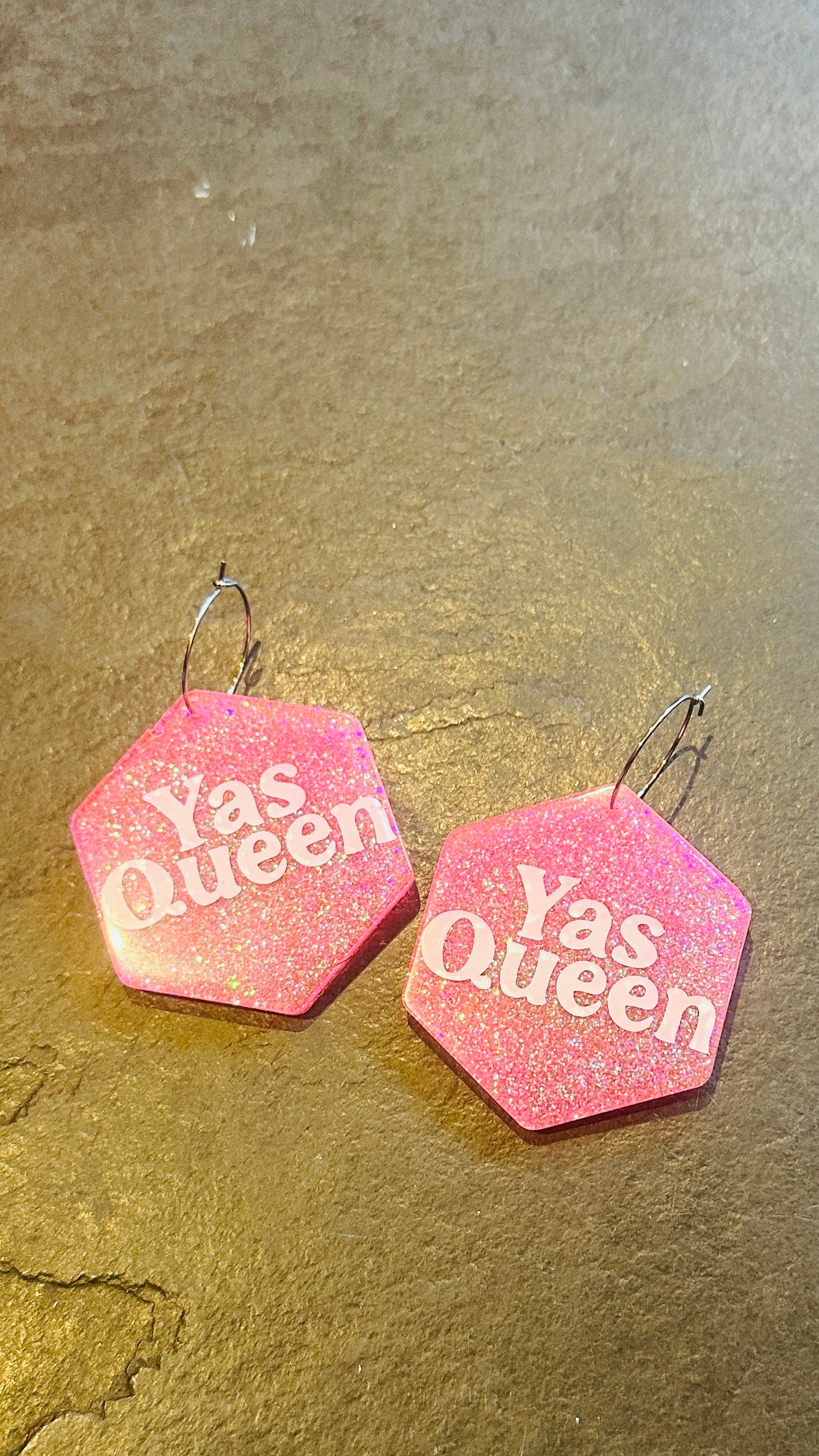 Yas queen handmade earrings! Slogan, pride, sterling silver, sparkle, glitter, statement, clip on, hoops