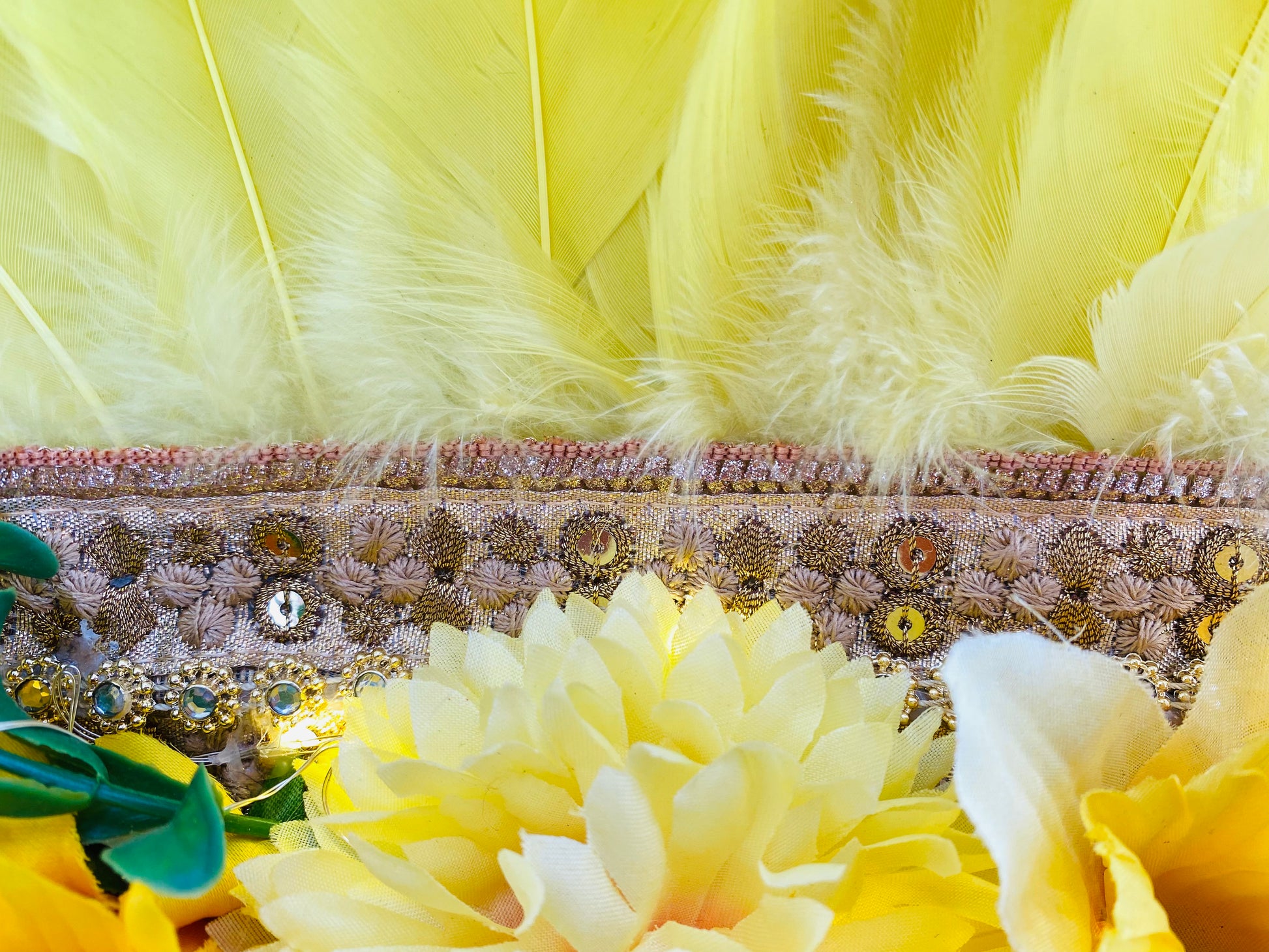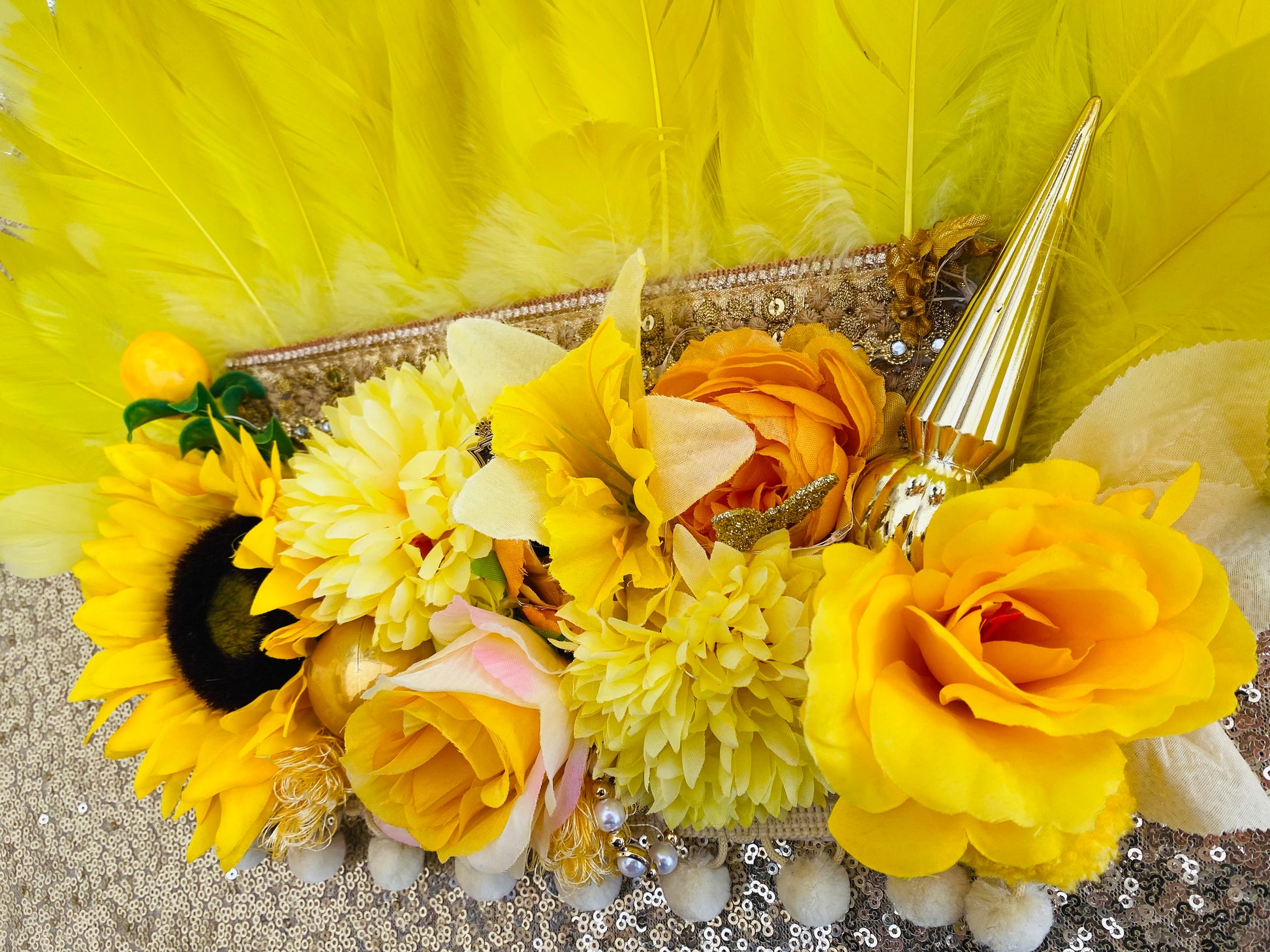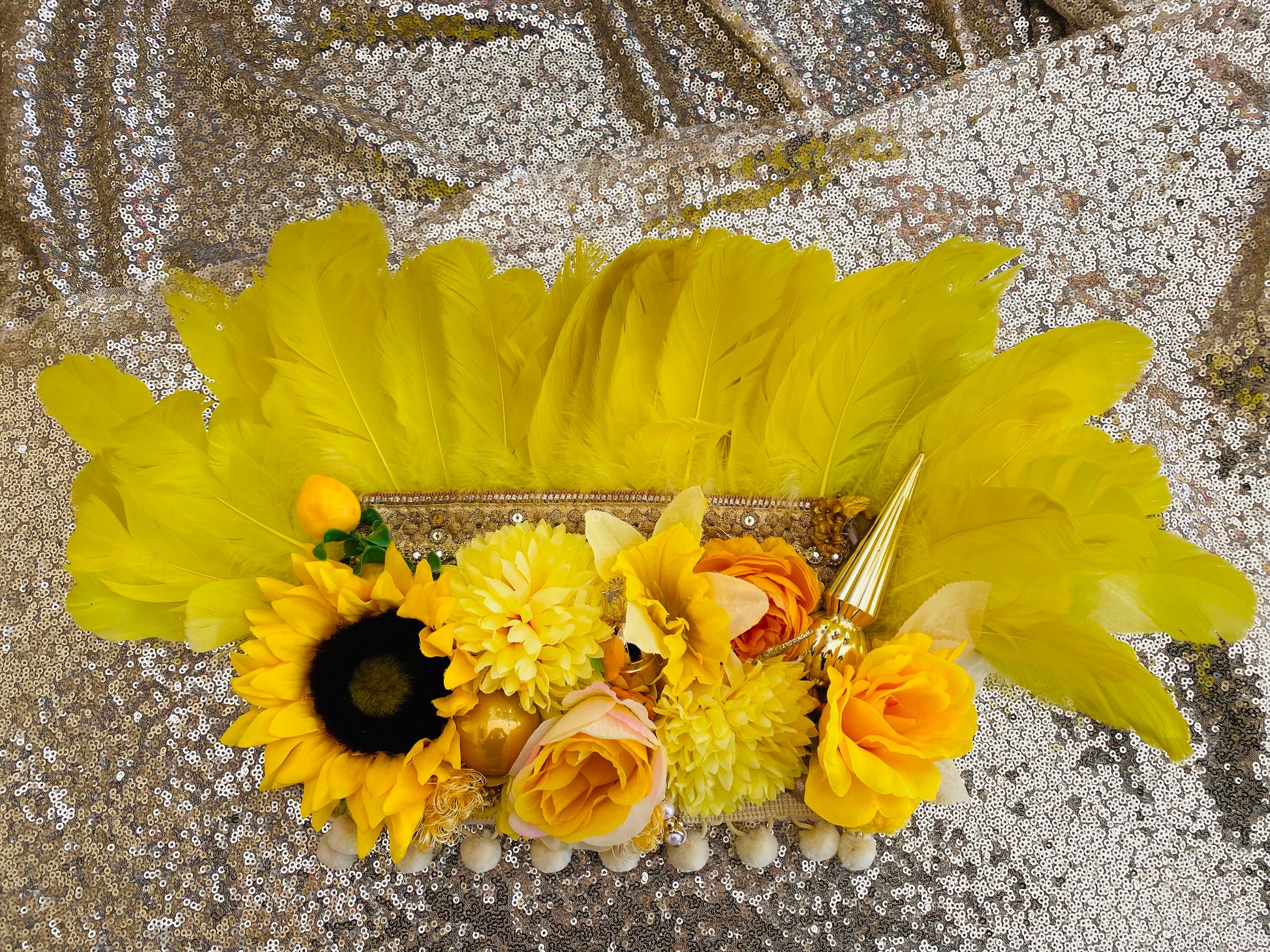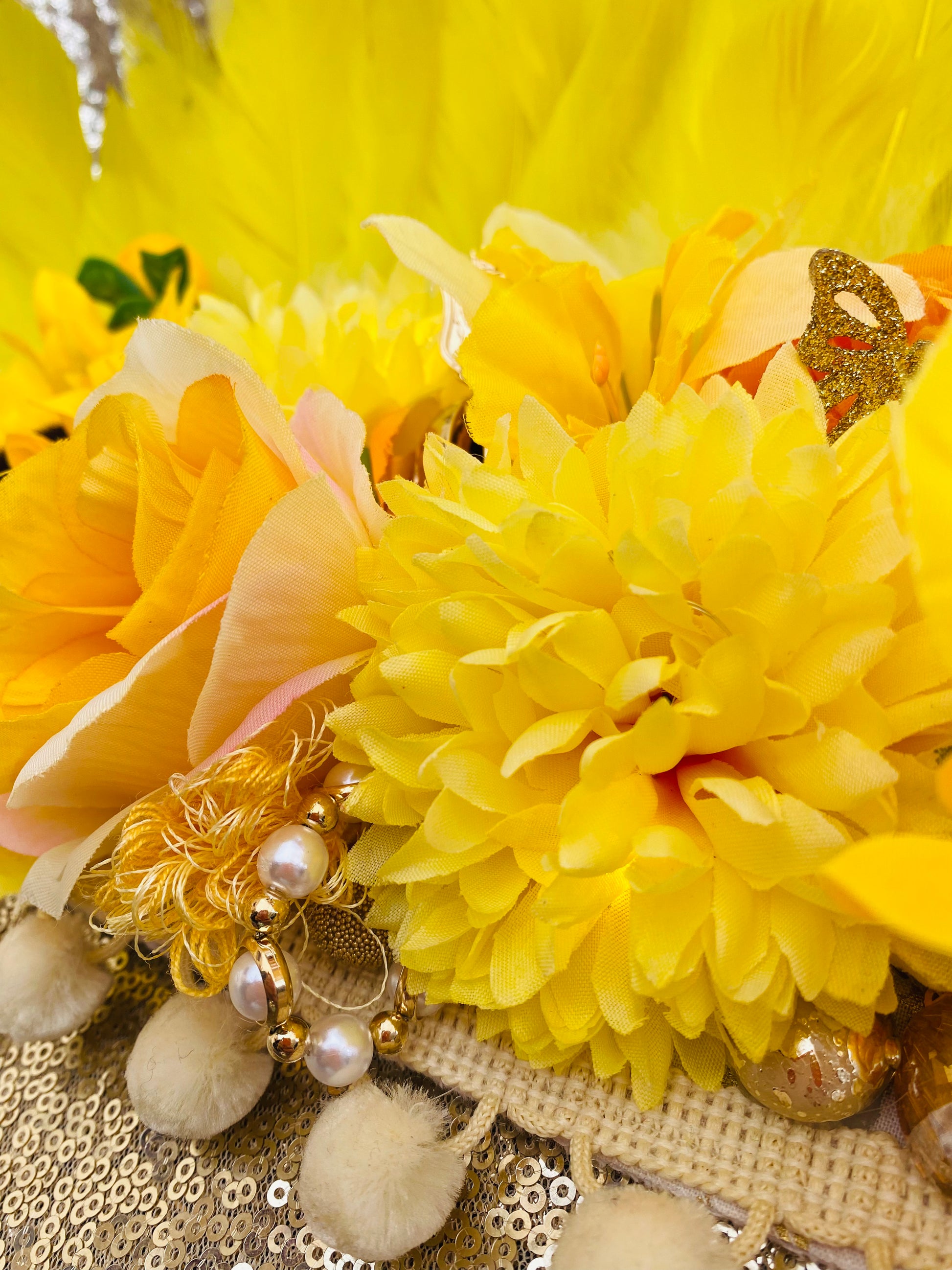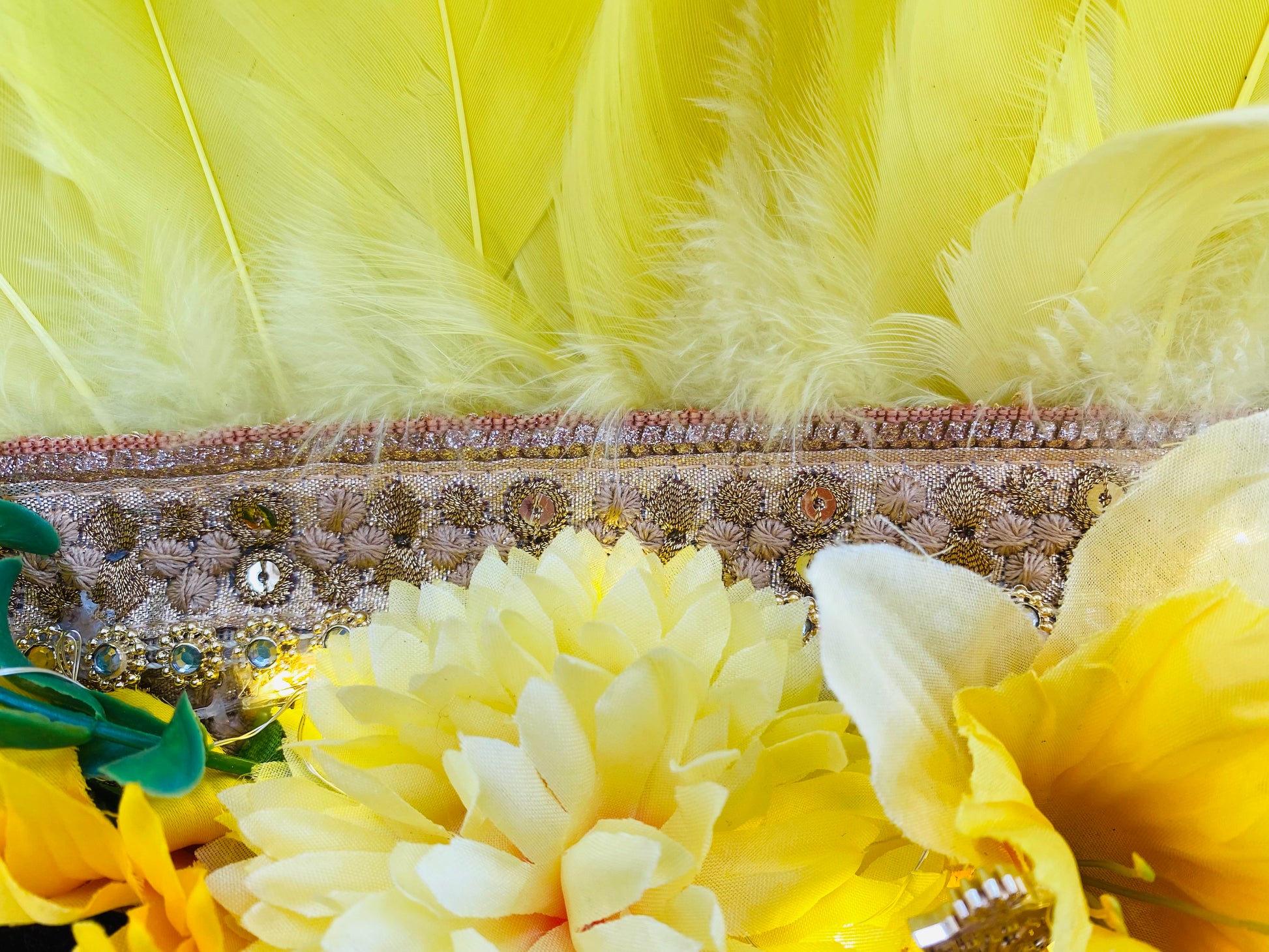 A real belter in the extravaganza range, this gloriously yellow headdress is bright! Made with bright yellow feathers, an assortment of flowers, such as roses, sunflowers, a daffodils, and dahlias, vintage upholstery trim, handmade pom poms, gold adornments, finished with a luxurious velvet cream trim. The top of the band is covered with sparkling Asian wedding trim. And this beauty has lights! Your headdress will be made to order, please let me know if you would like anything particular added.