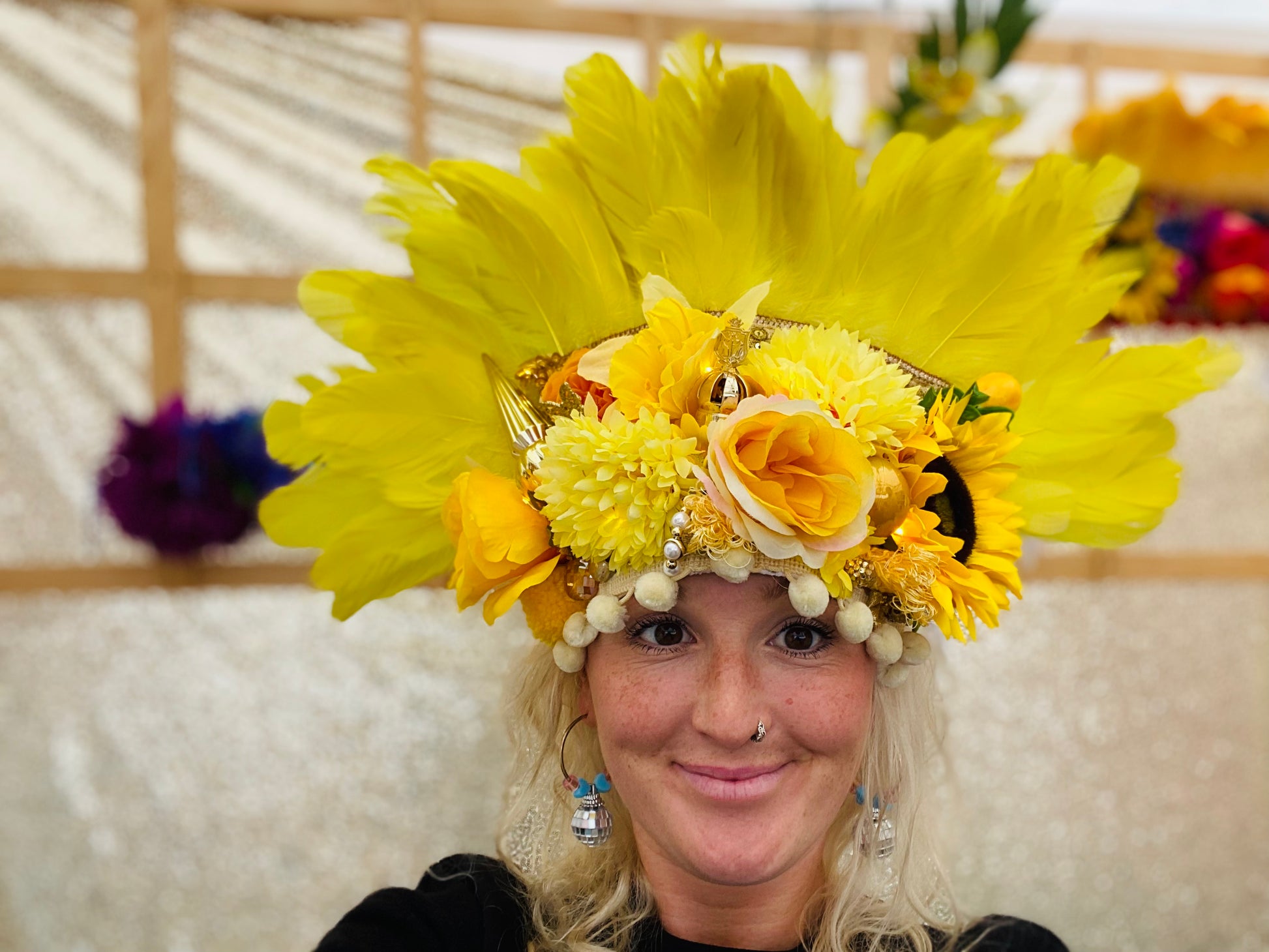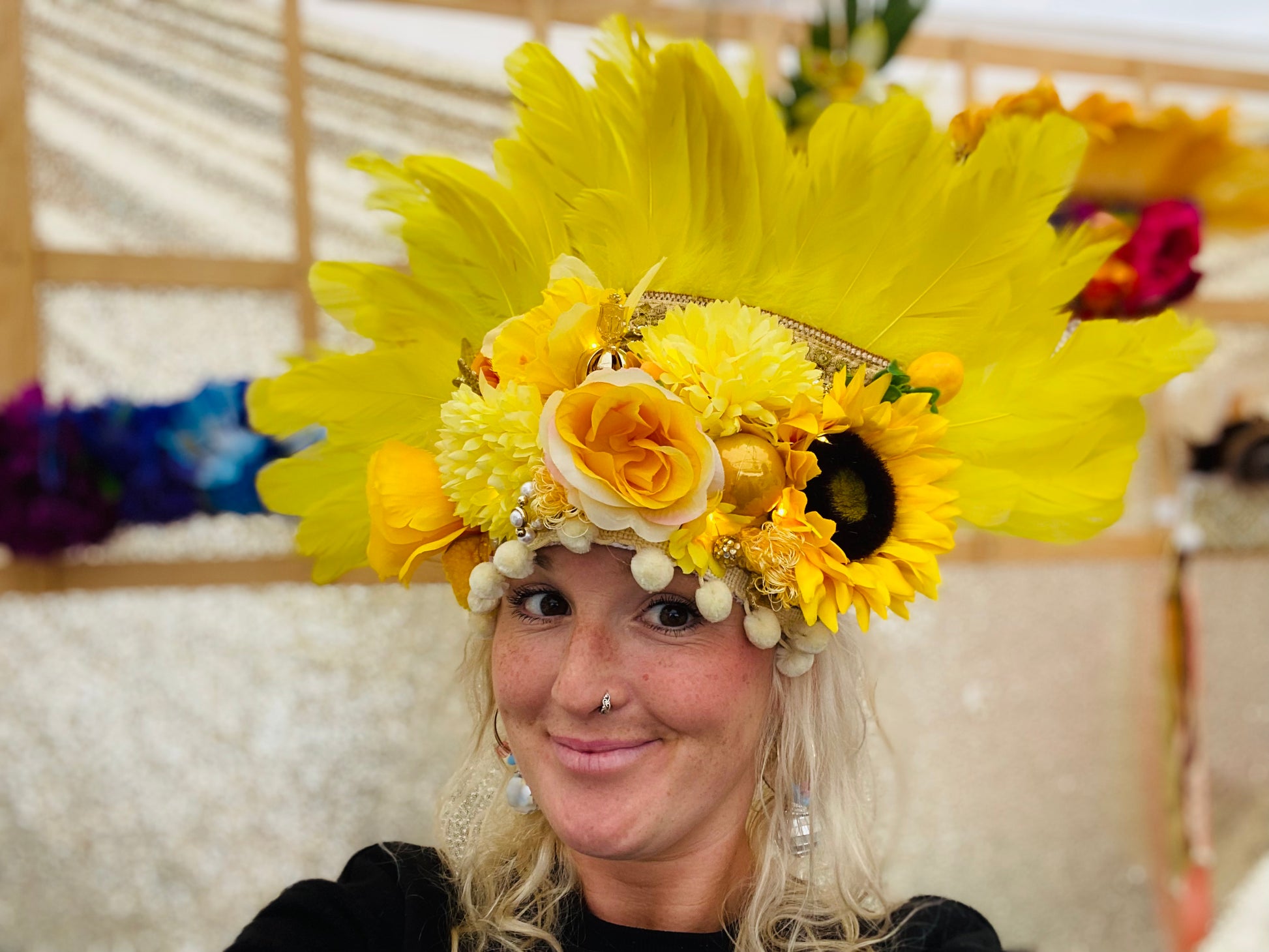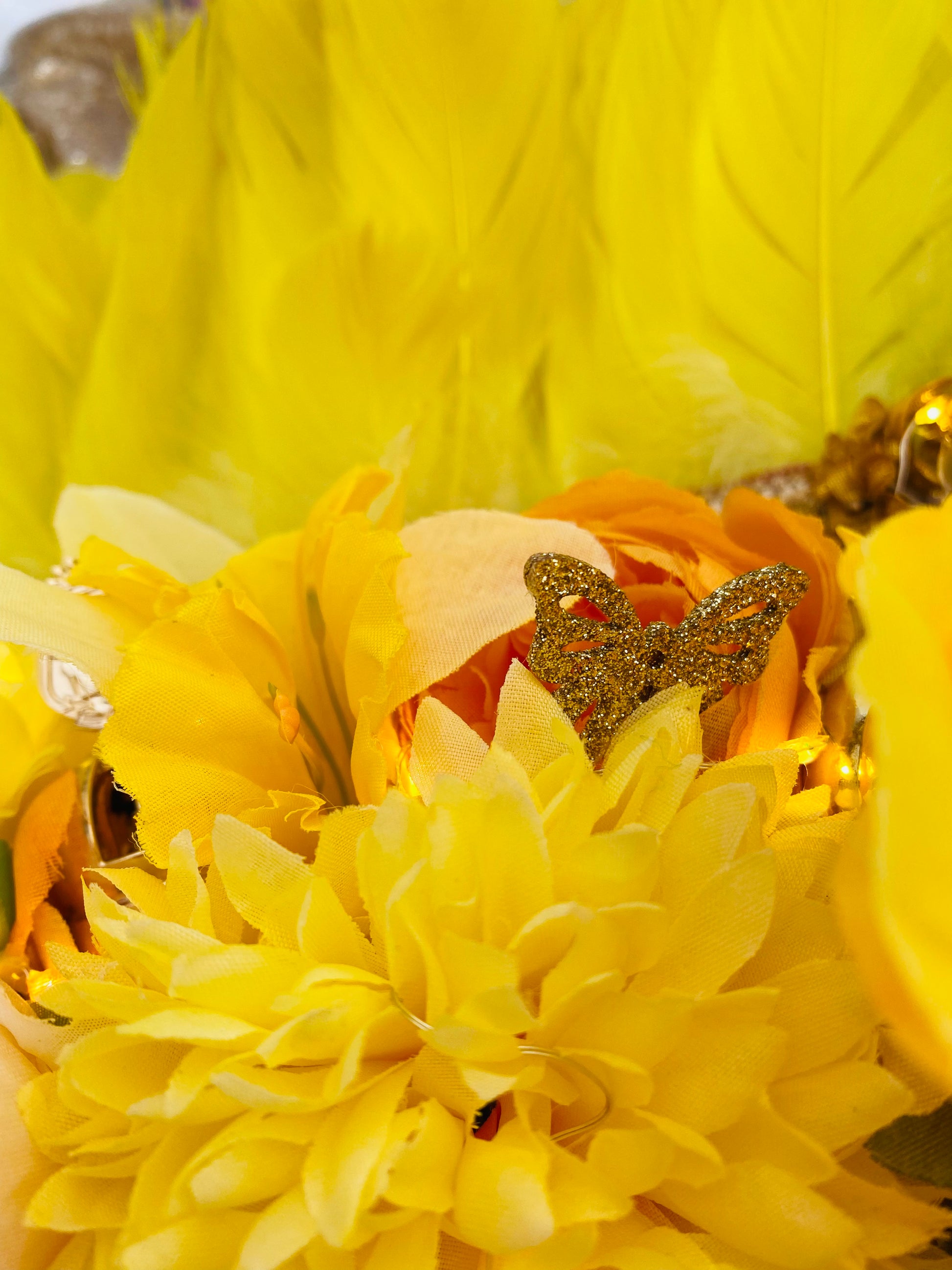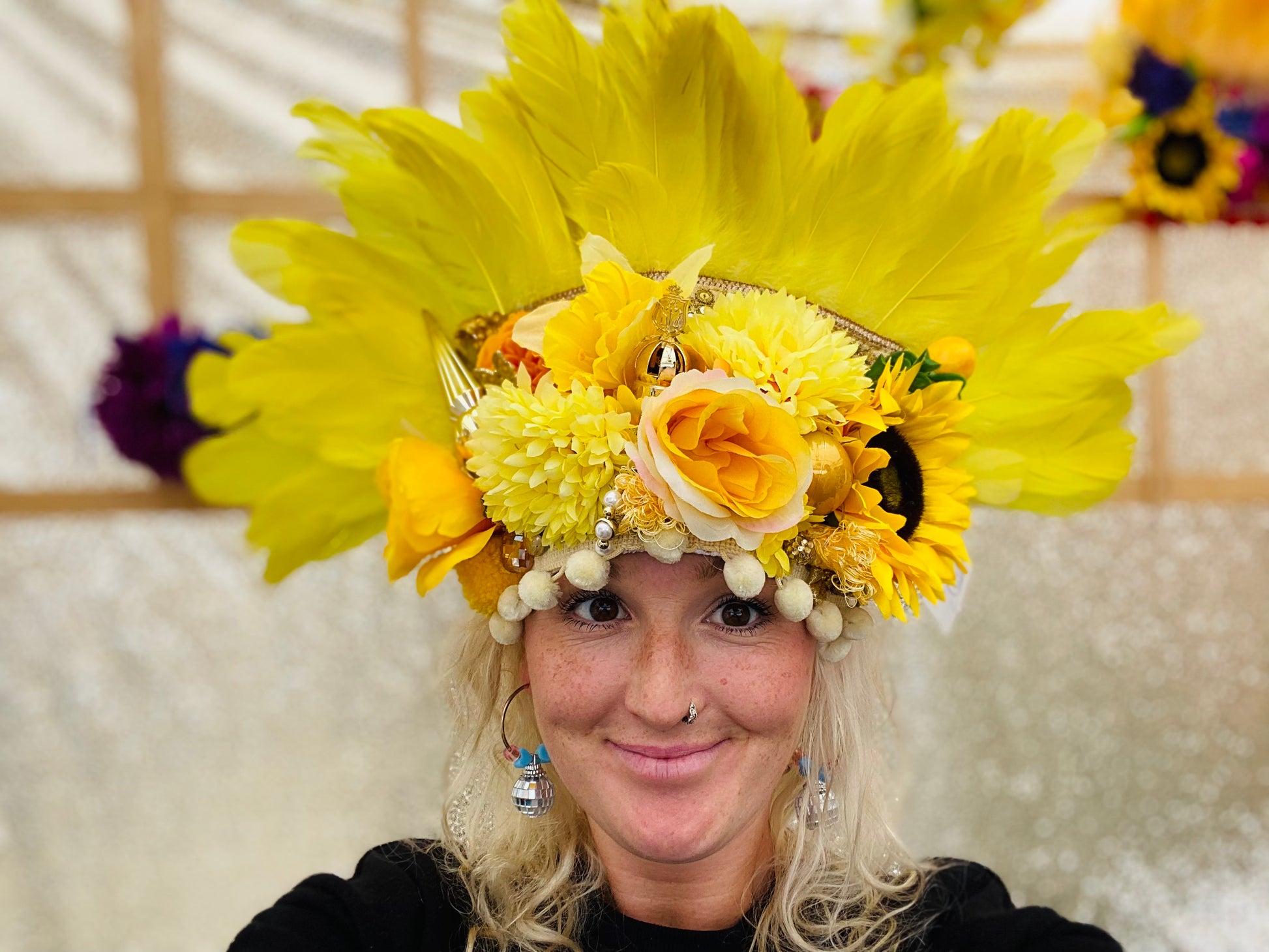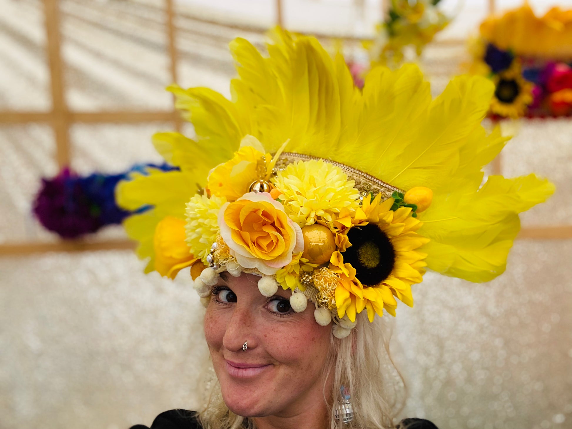 A real belter in the extravaganza range, this gloriously yellow headdress is bright! Made with bright yellow feathers, an assortment of flowers, such as roses, sunflowers, a daffodils, and dahlias, vintage upholstery trim, handmade pom poms, gold adornments, finished with a luxurious velvet cream trim. The top of the band is covered with sparkling Asian wedding trim. And this beauty has lights! Your headdress will be made to order, please let me know if you would like anything particular added.