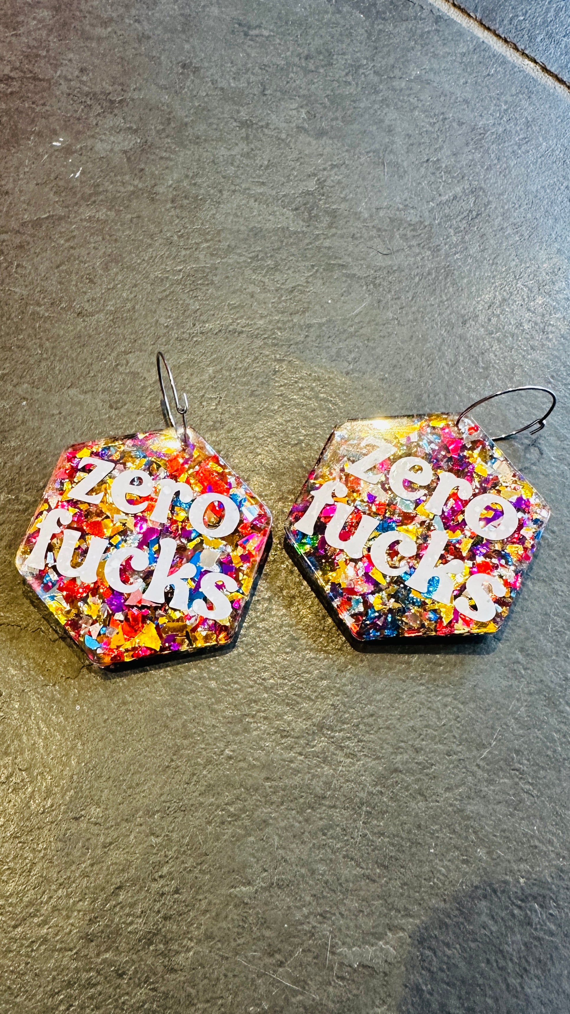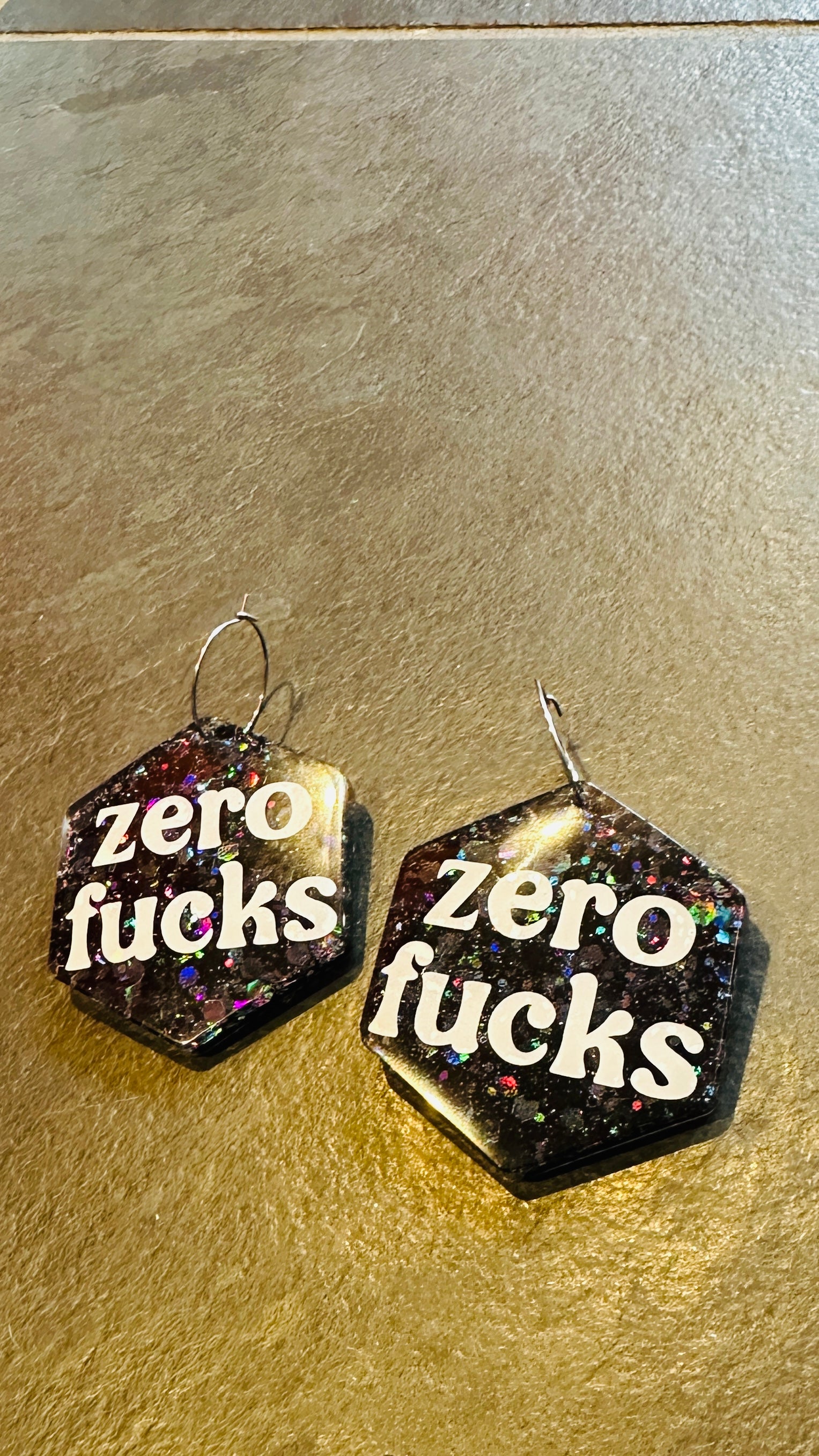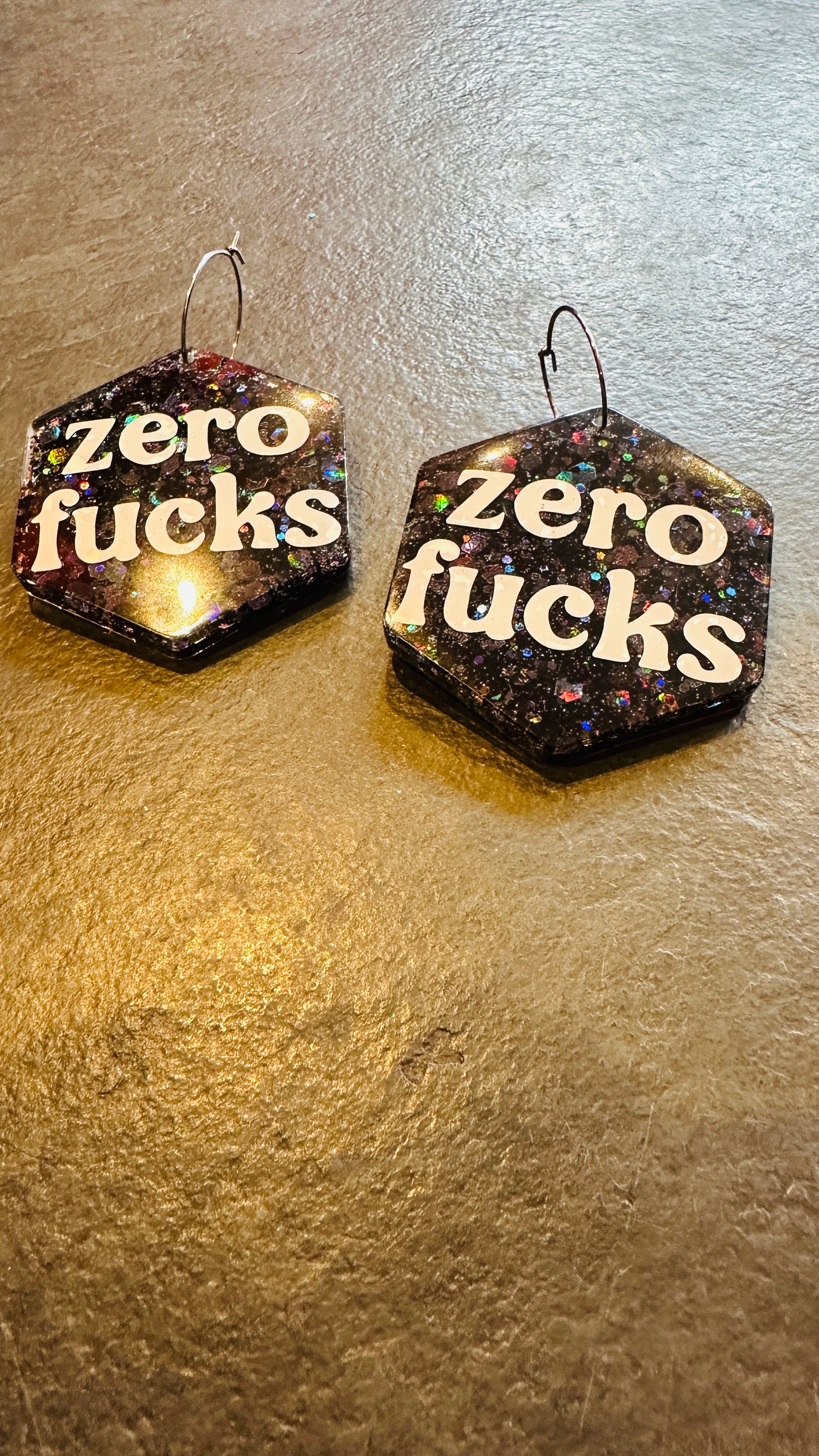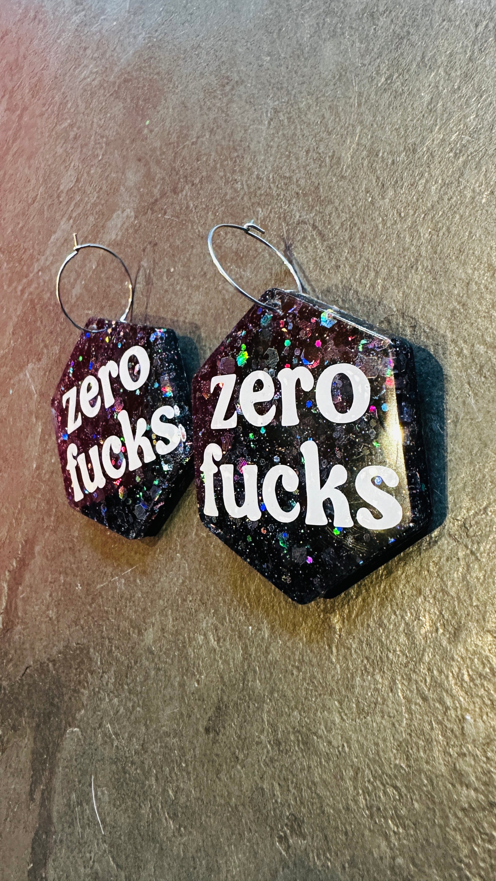 Zero f*cks earrings, slogan, resin, rude, sweary, mature, adult, glitter, silver