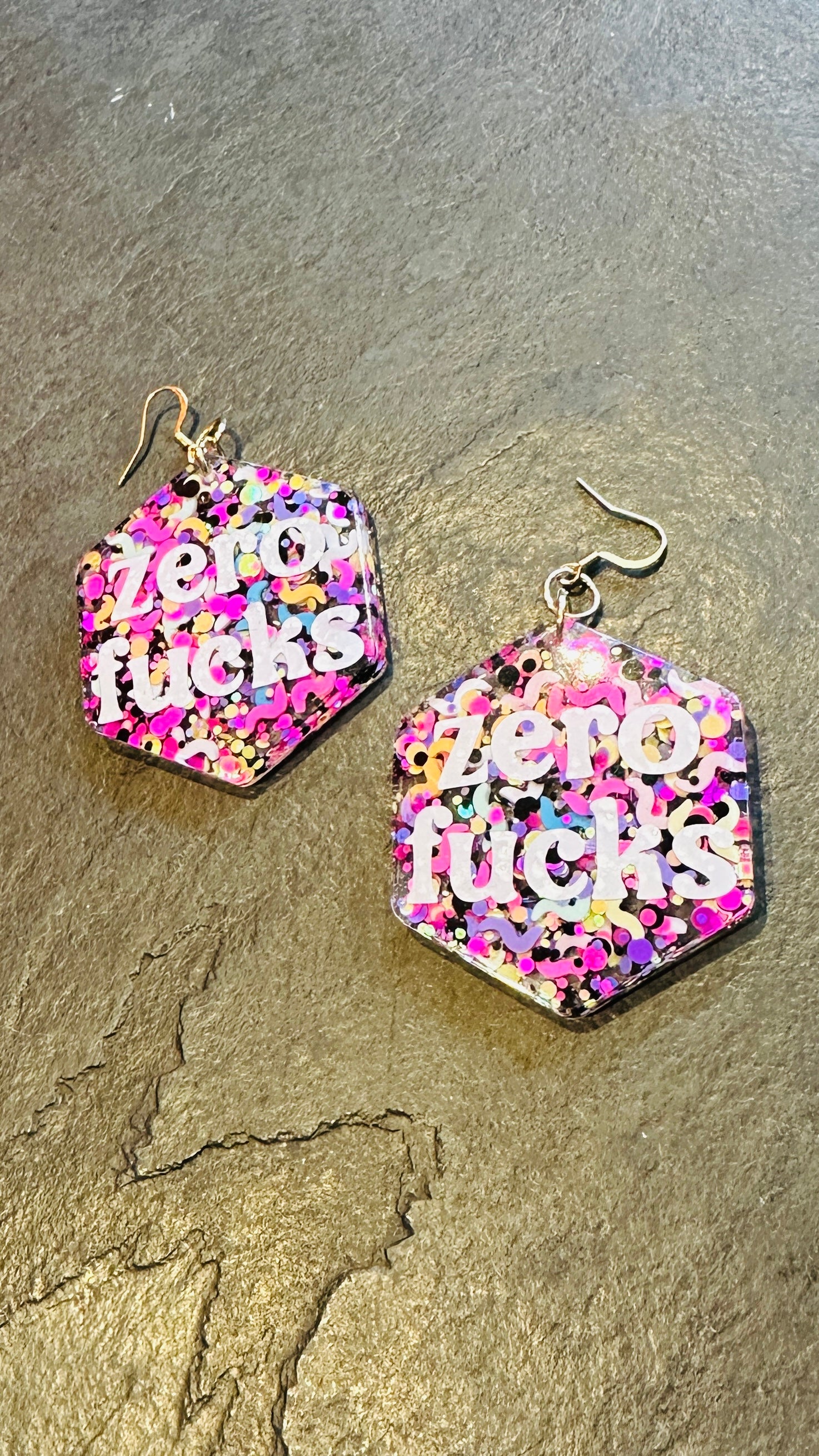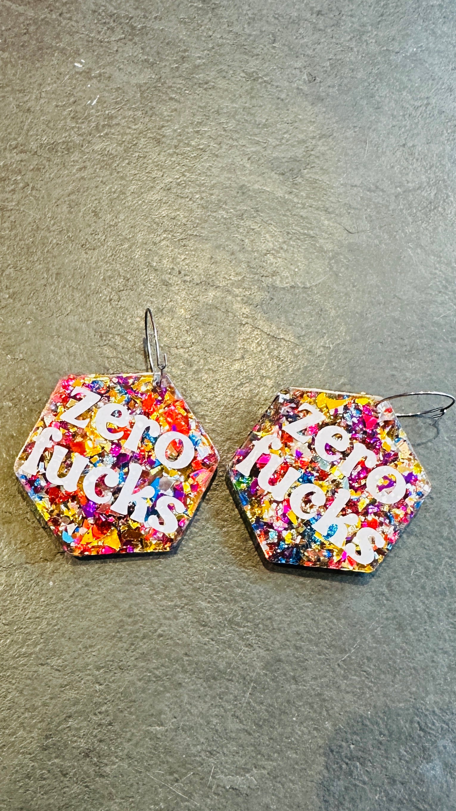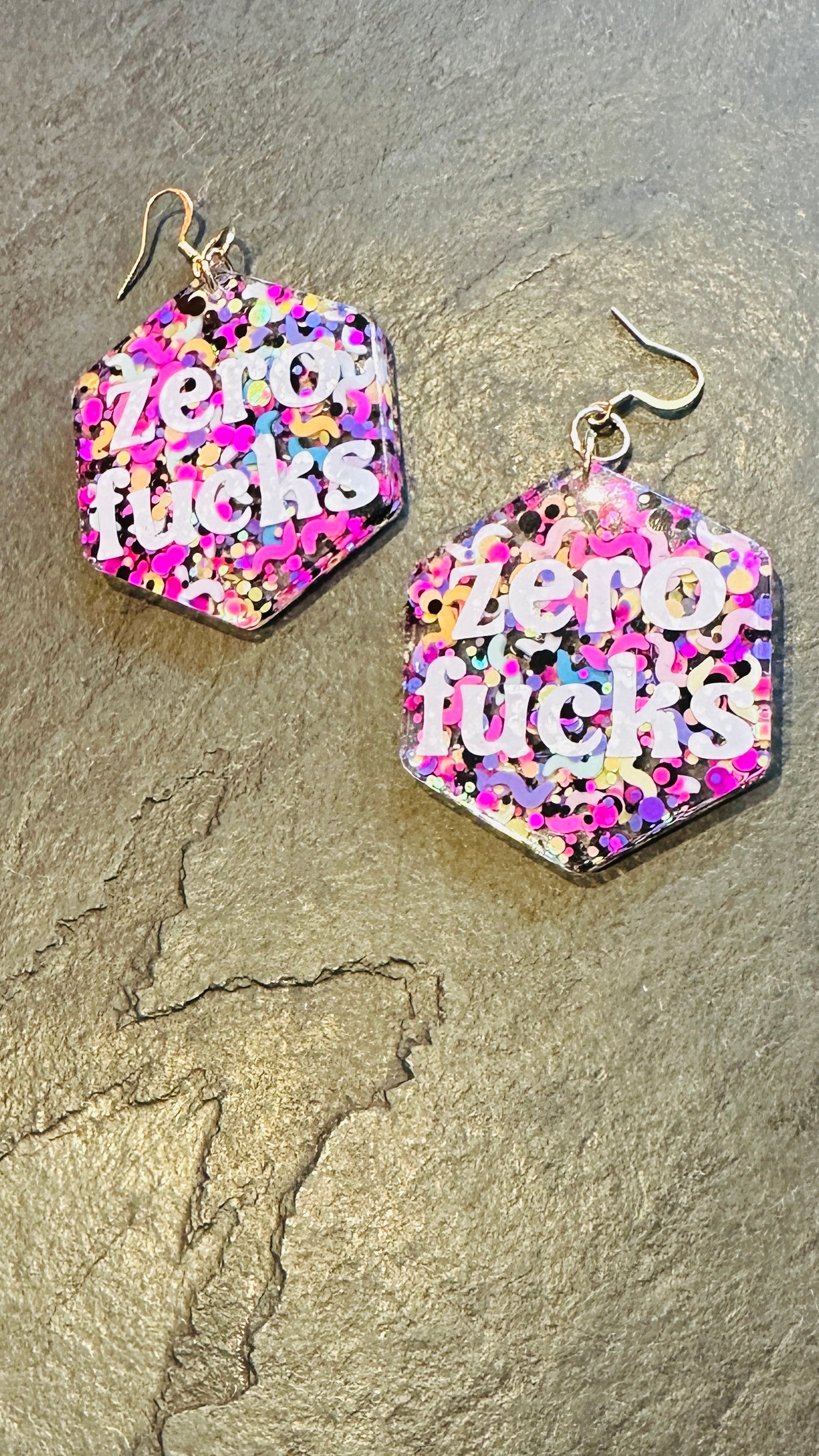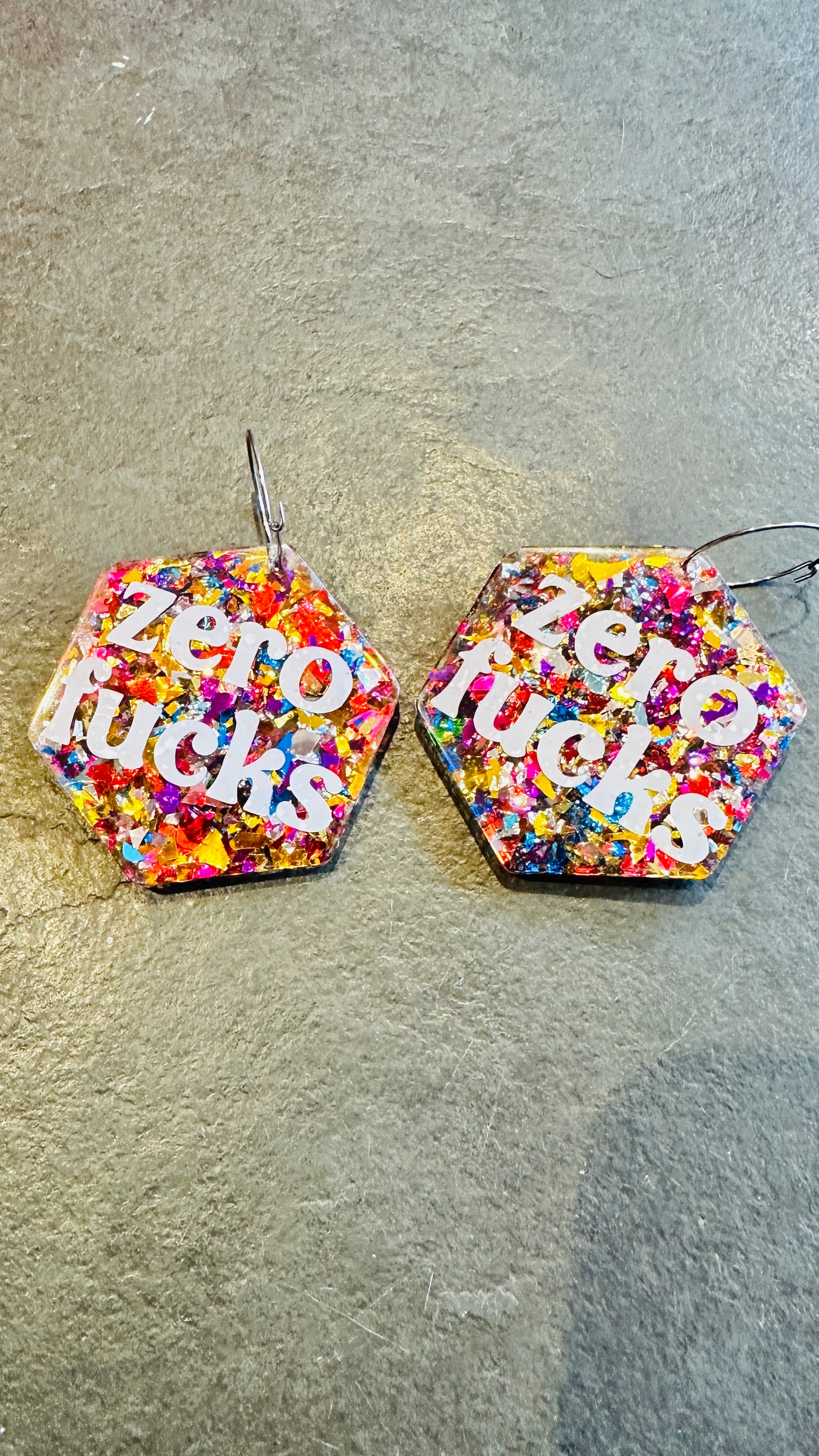 Zero f*cks earrings, slogan, resin, rude, sweary, mature, adult, glitter, silver
